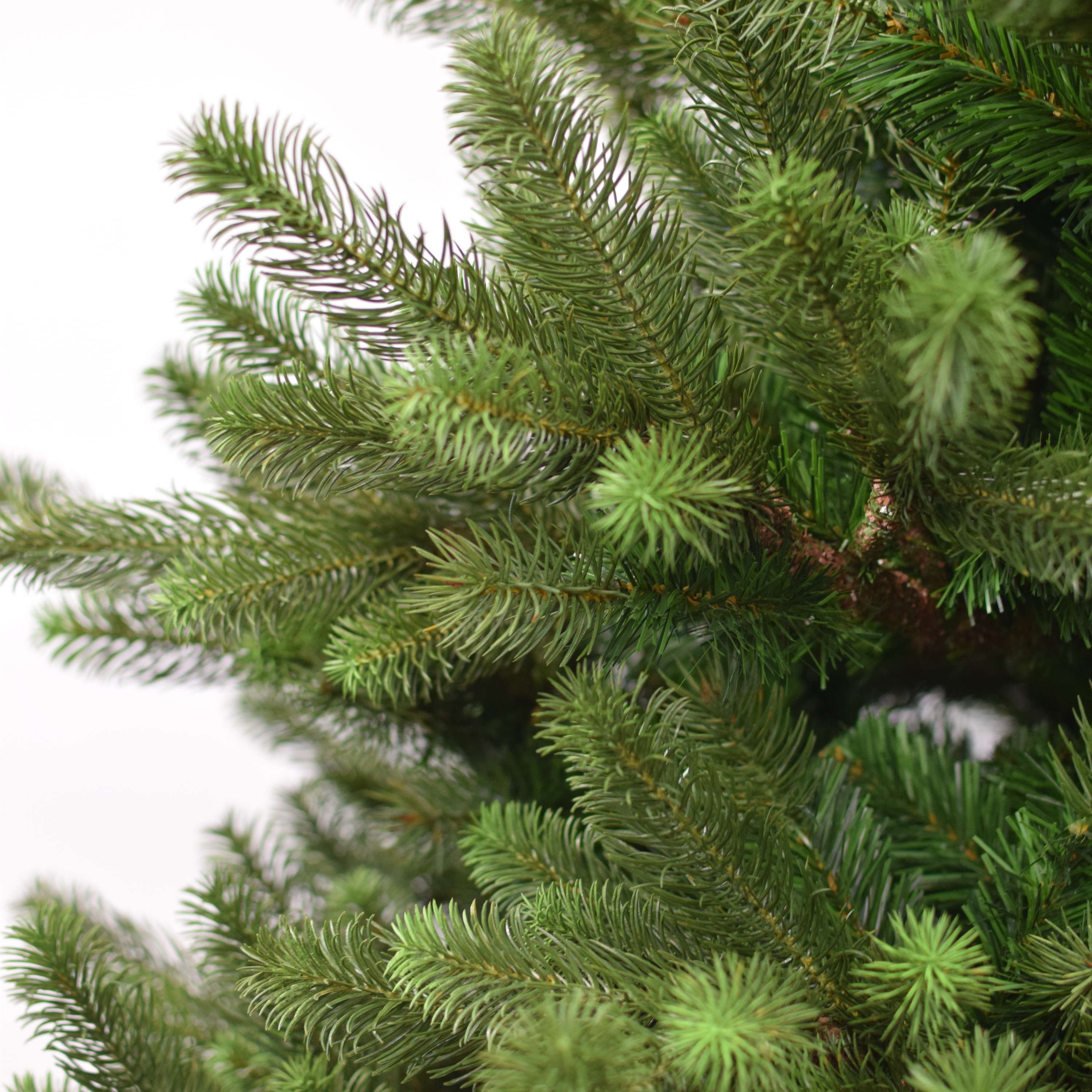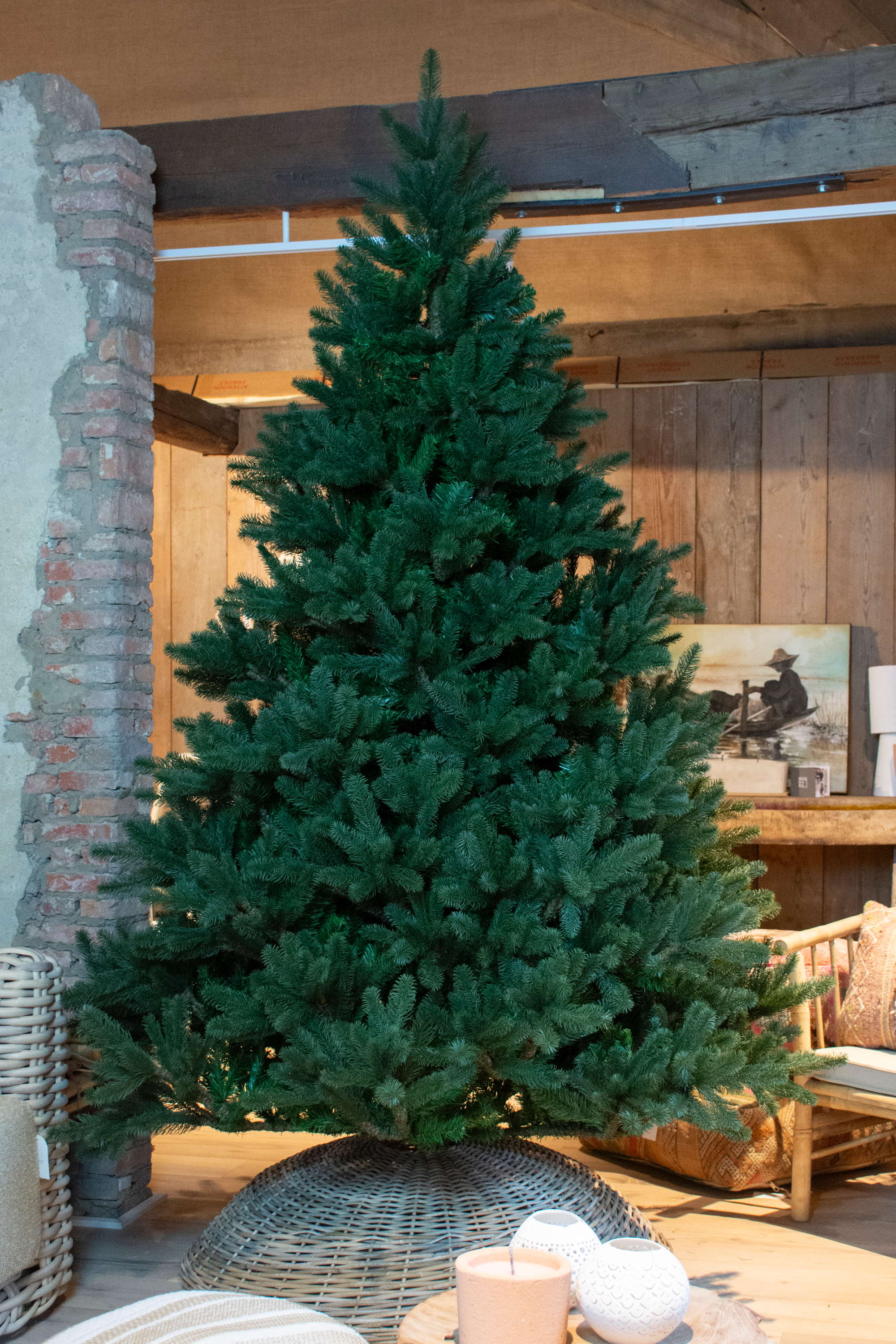 Abeto decorativo/Abeto de plástico LYON de color verde con soporte de madera y ramas de aguja de PE/PVC. El abeto artificial de Navidad posee una altura de aprox. 200 cm, un diámetro de aprox. 125 cm y es ideal como decoración para el salón de casa o para restaurantes, escaparates, puestos de feria, etc.