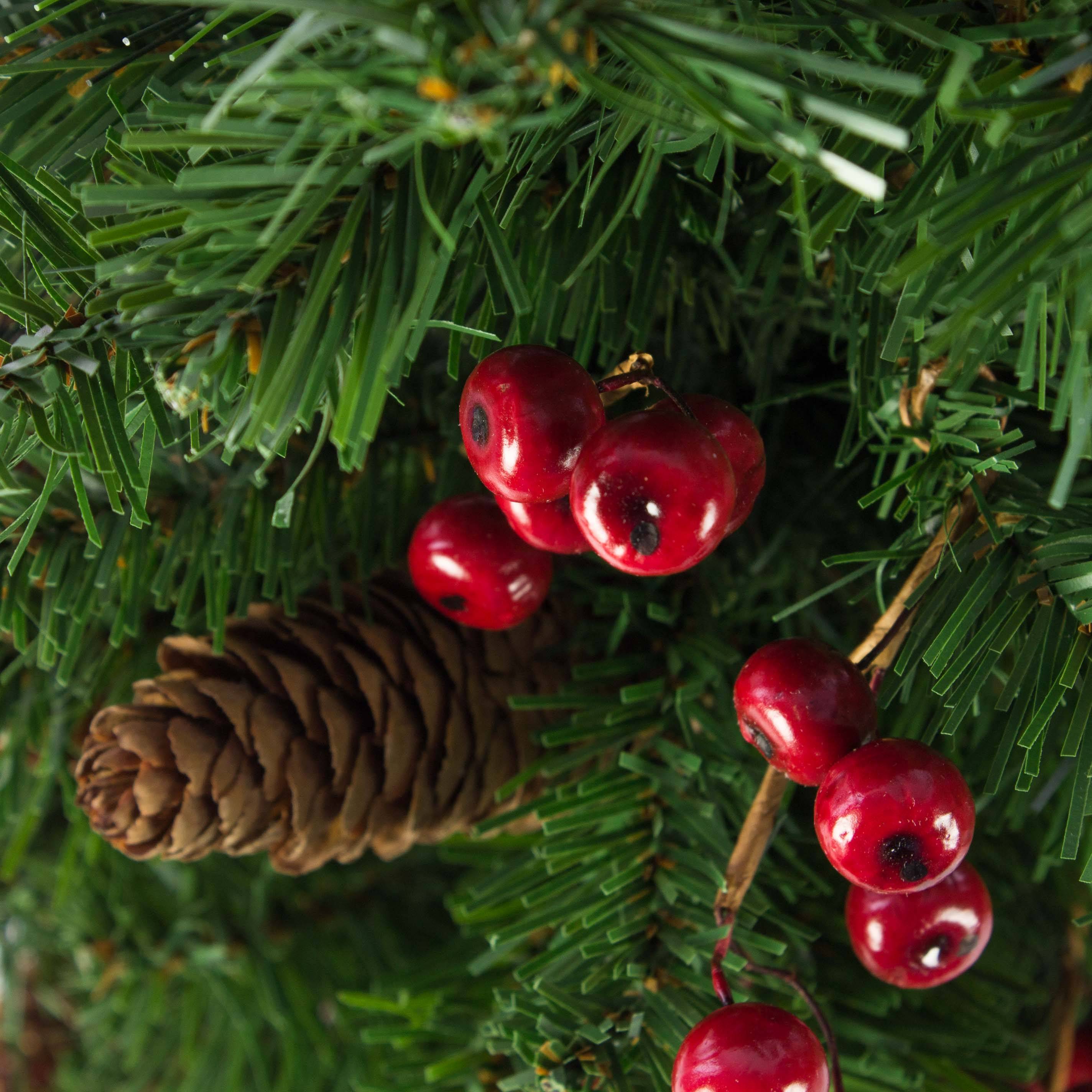 - Con aproximadamente 75 ramas flexibles en color verde, decoradas con grosellas rojas y piñas