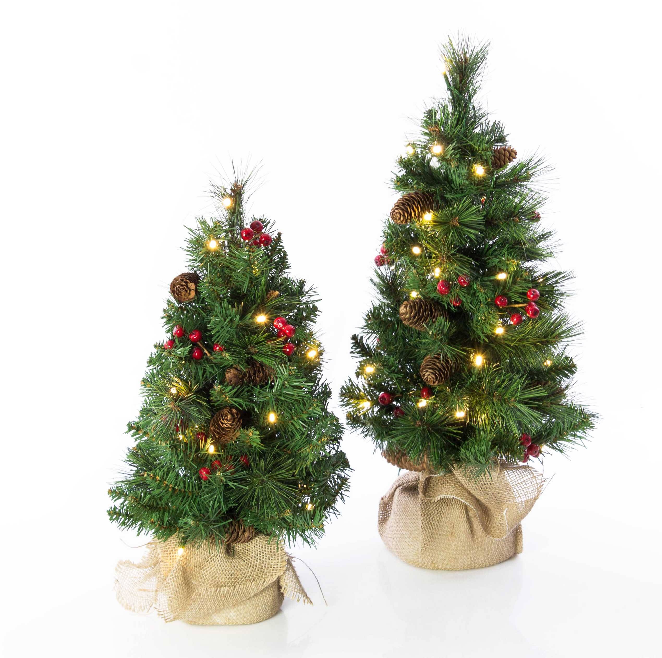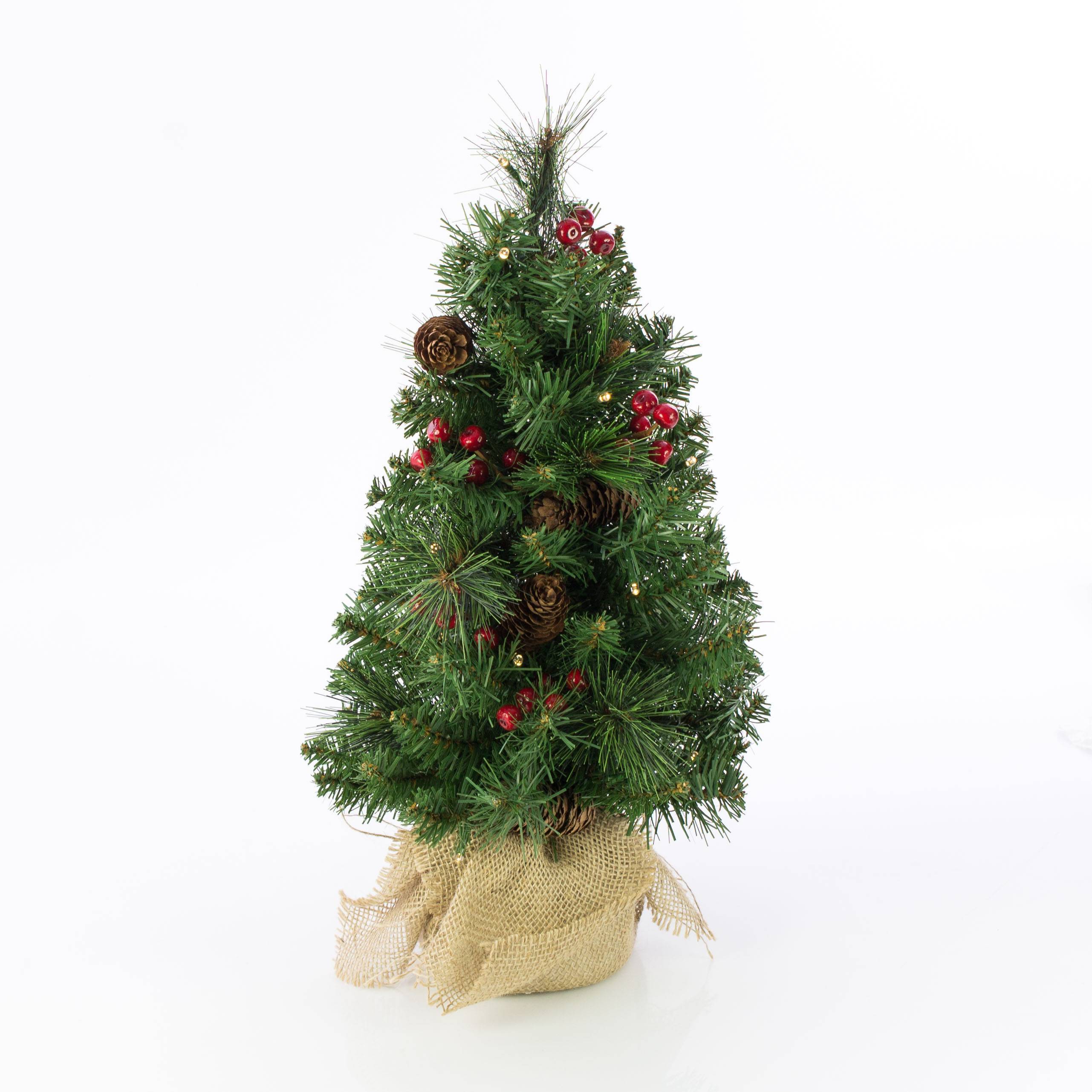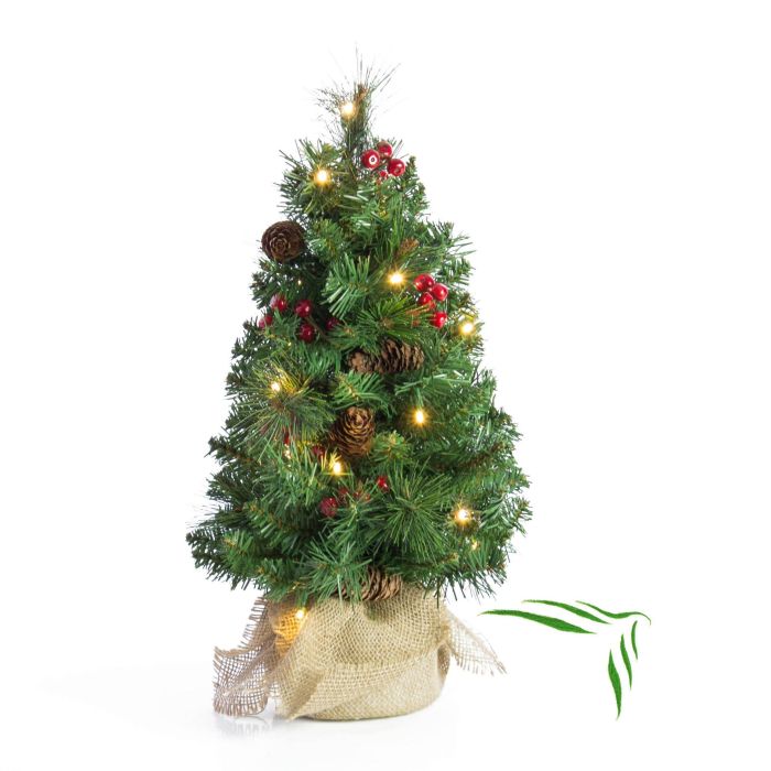 El árbol de Navidad artificial BUKAREST está decorado con grosellas rojas, piñas y 15 luces. Las ramas artificiales verdes se pueden doblar y están fijadas al tronco del árbol. La entrega del abeto de aproximadamente 45 cm de alto y aproximadamente 25 de ancho se realiza en una bolsa de yute marrón.