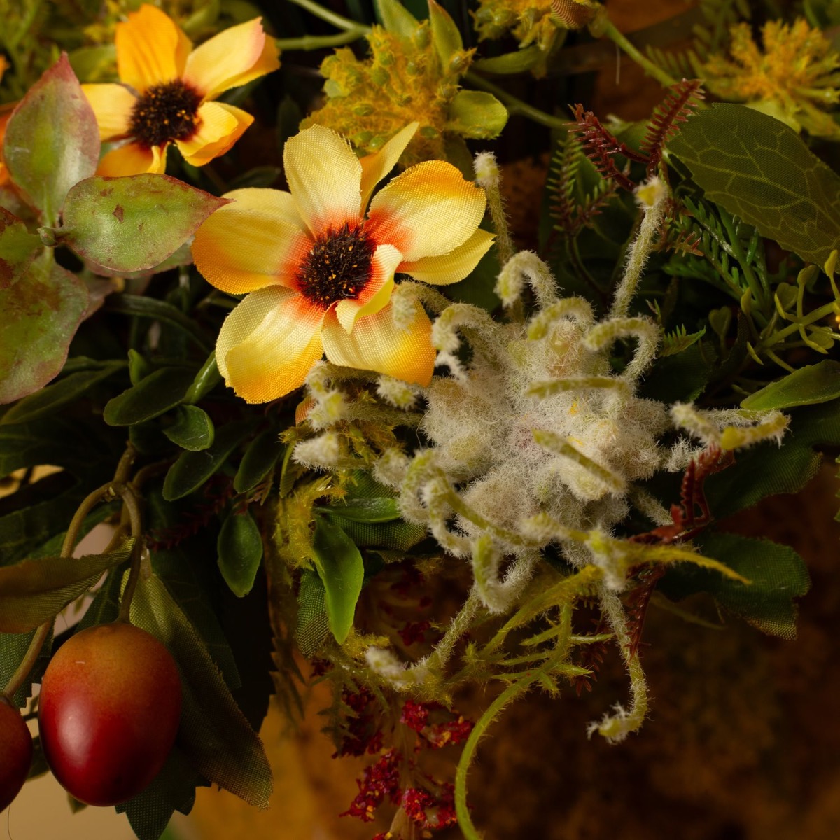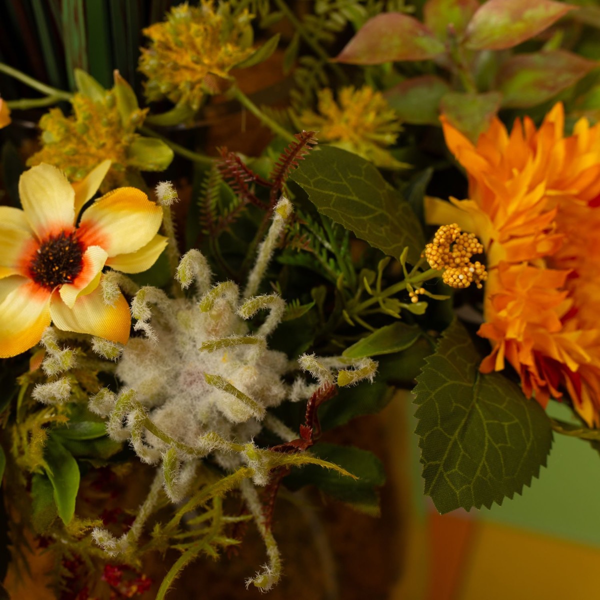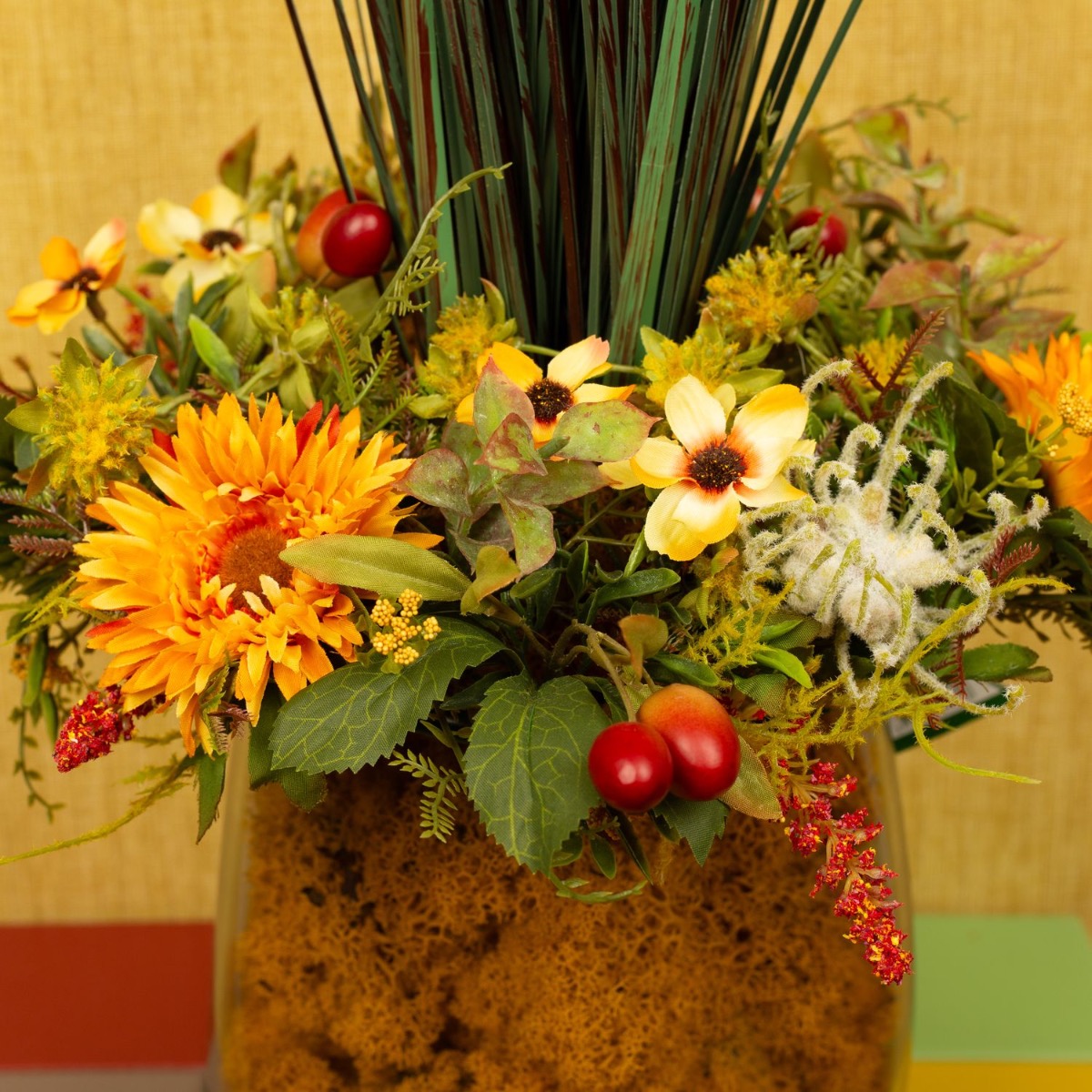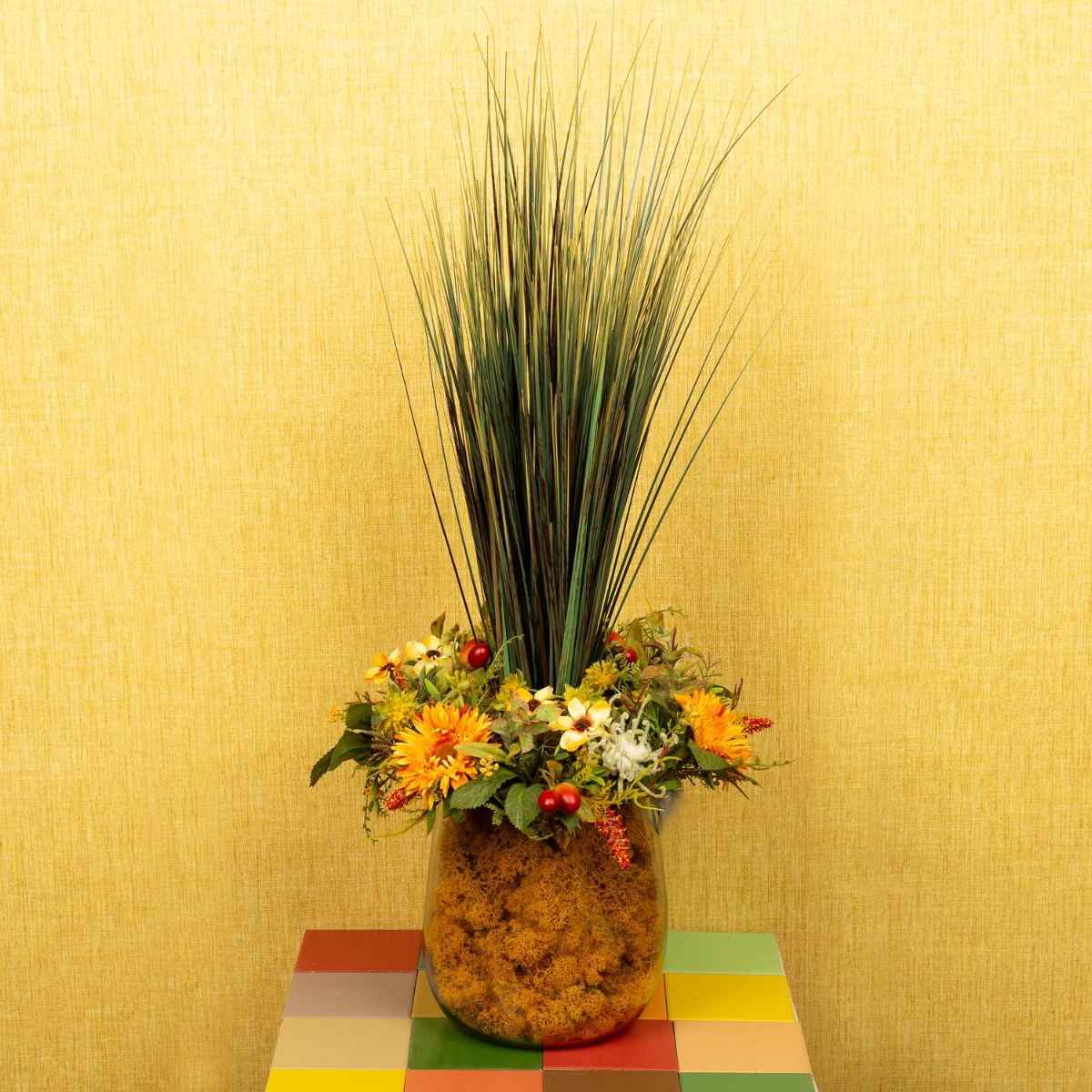 Naranja y verde! Este look otoñal es sencillo y a la vez muy efectivo. Una colorida corona otoñal compuesta por flores típicas del otoño adorna el inusual jarrón con un diseño abollonado. La hierba cola de zorro verde-marrón destaca en el centro y hace brillar el look. Compra el look!