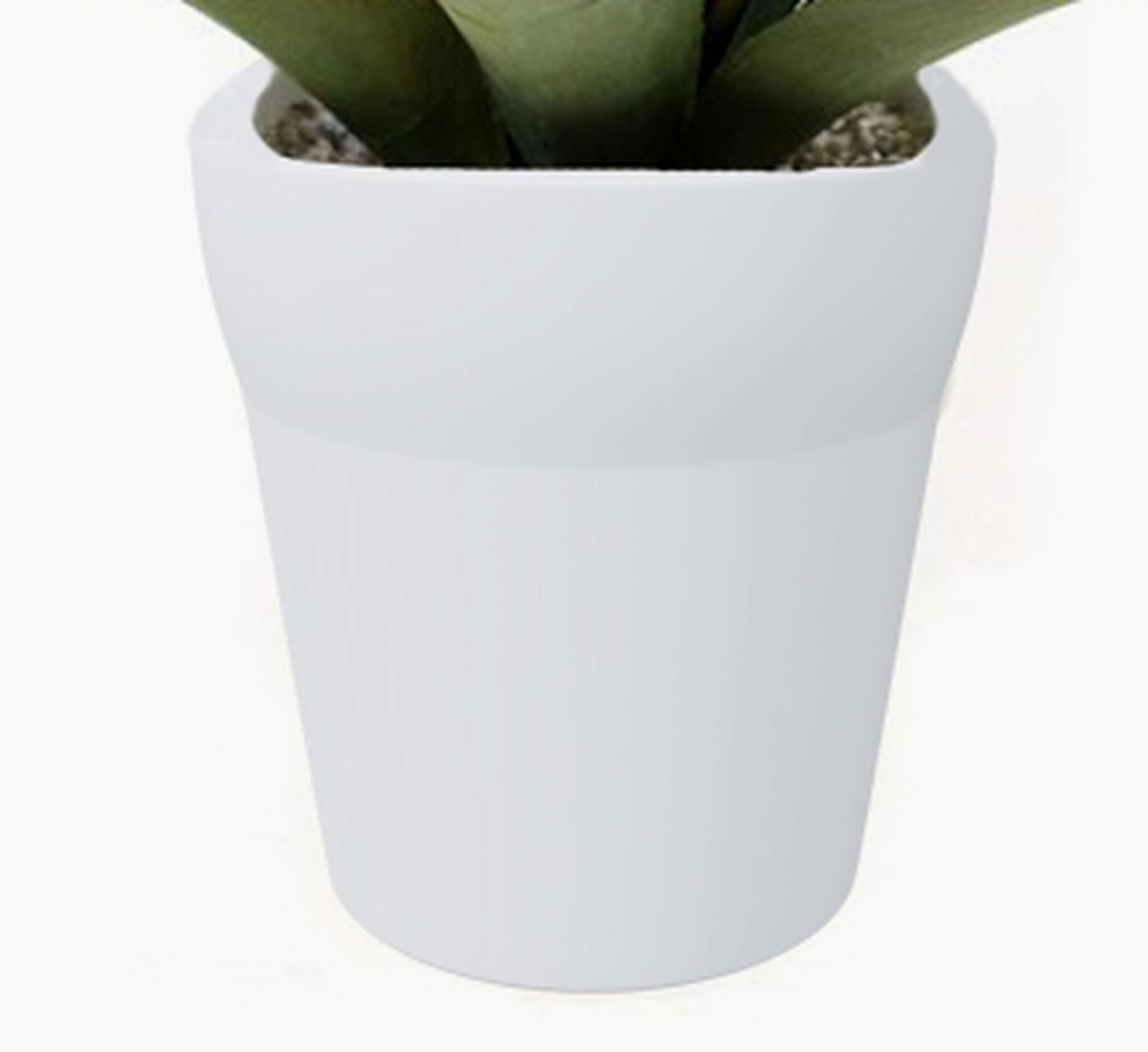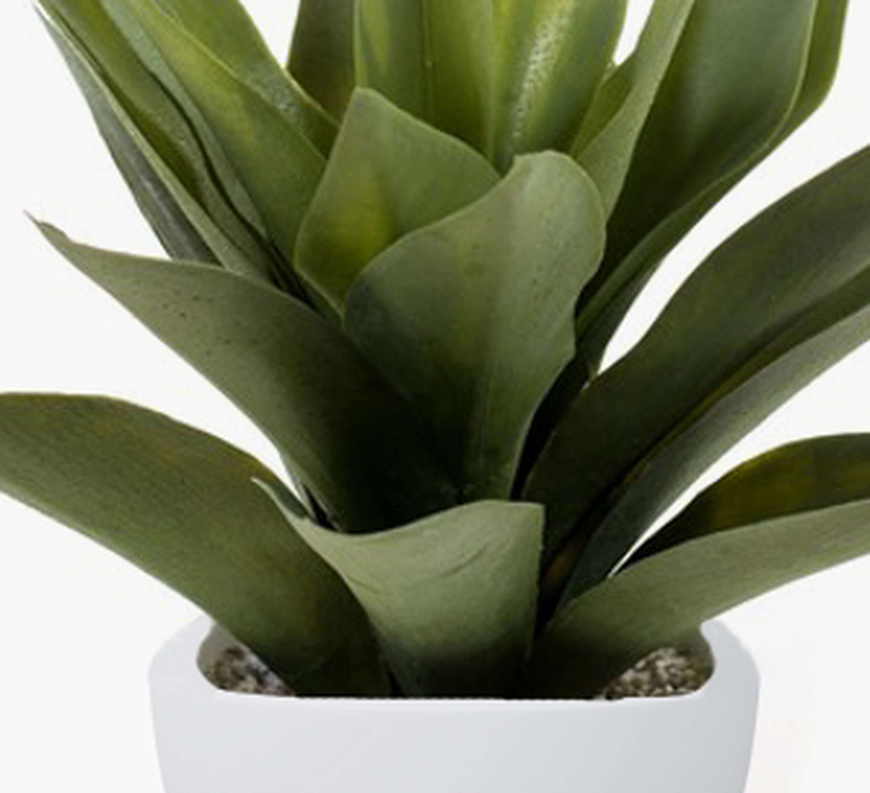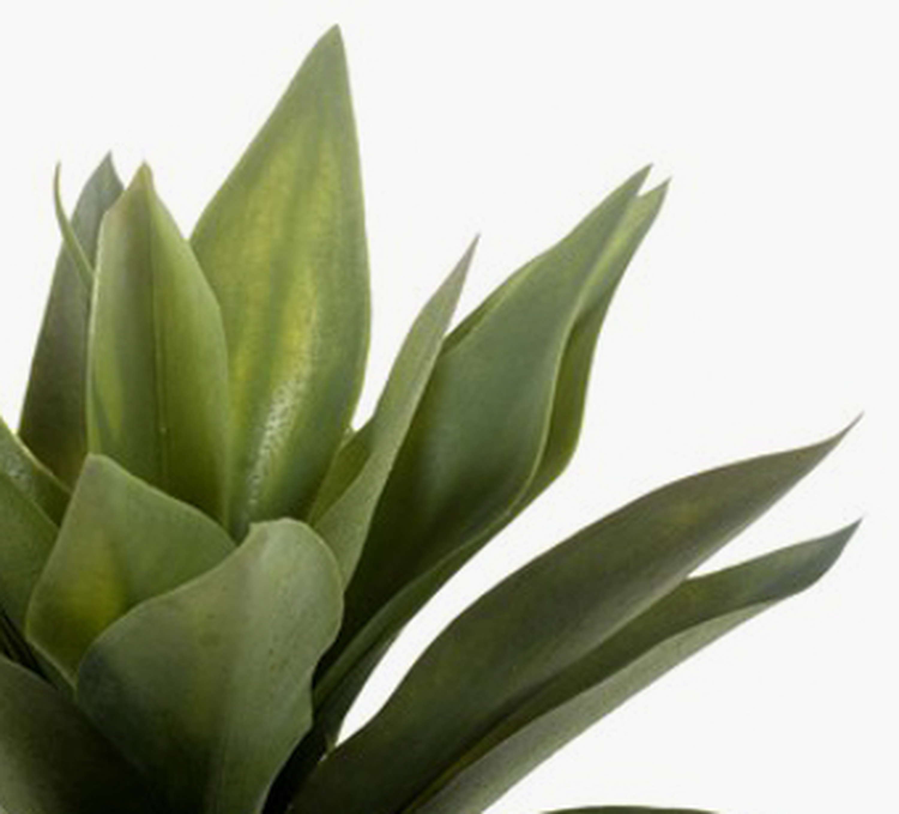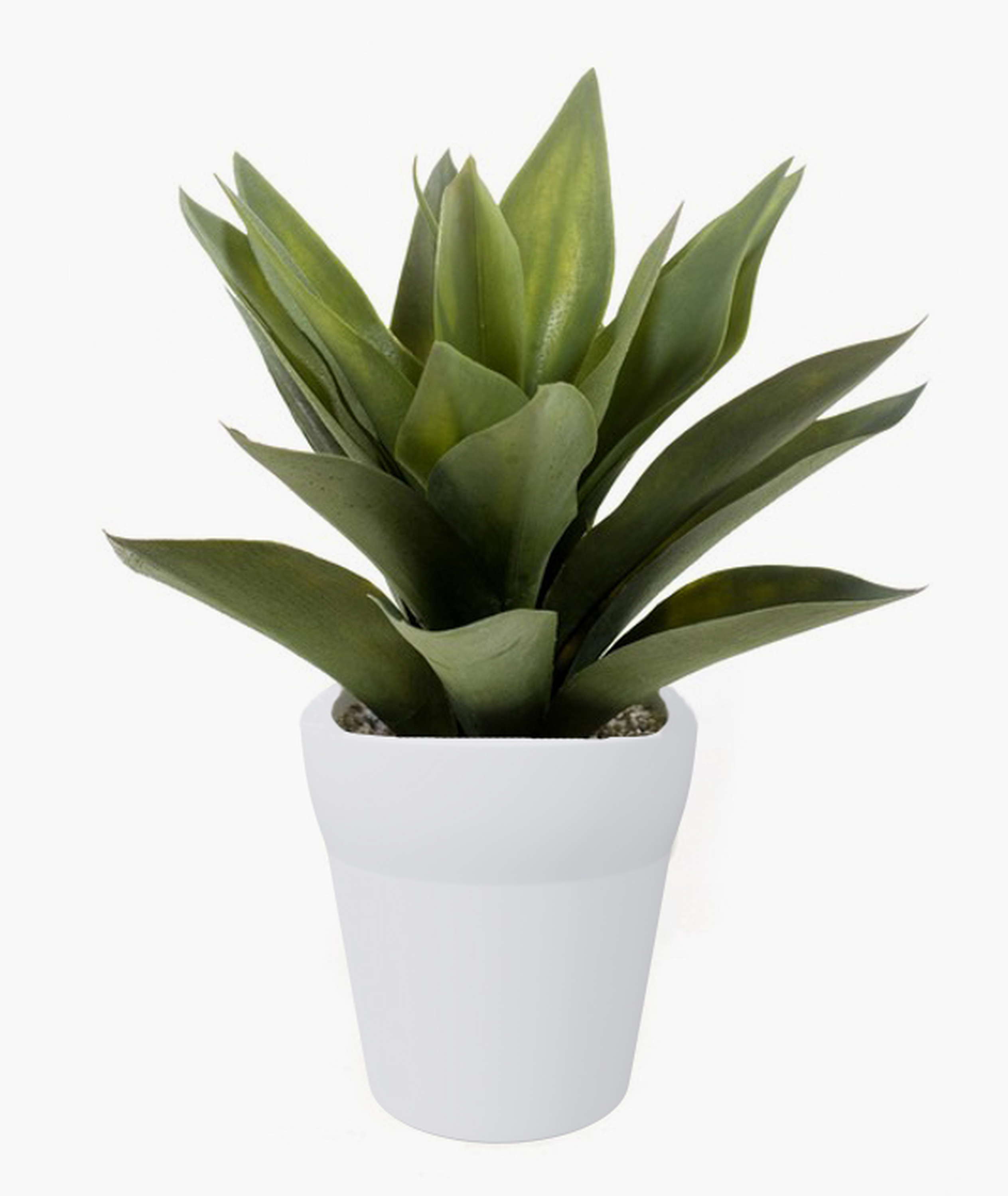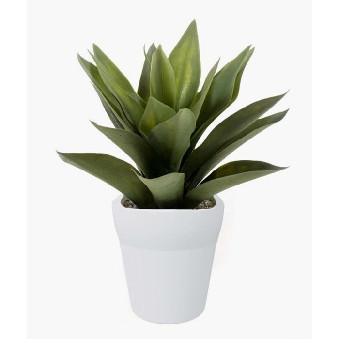 Agave artificial con 20 hojas verdes en un tiesto blanco de terracota. La planta artificial posee una altura aproximada de 30 cm.