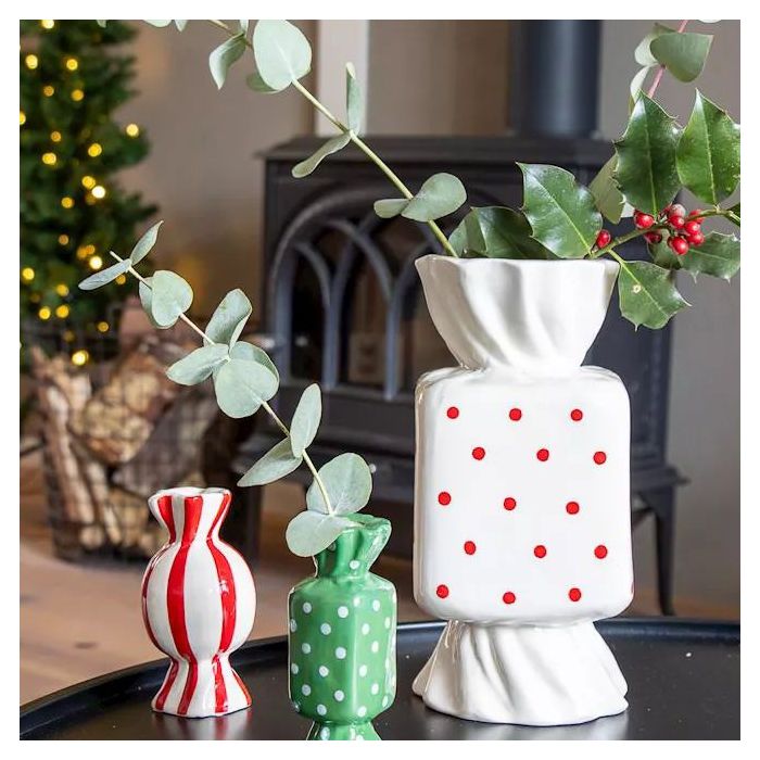 ¡Toques de color para momentos festivos! Los pequeños y divertidos jarrones de cerámica en forma de caramelo aportan toques de color y transmiten alegría. Decorados de forma minimalista con ramas de acebo y eucalipto, crean encantadores arreglos invernales que, además, transmiten alegría. Al fondo, un árbol de Navidad con guirnaldas luminosas brilla y baña la escena con una luz cálida y mágica. Una combinación evocadora de color, naturaleza y magia navideña, perfecta para disfrutar con estilo de los momentos invernales. ¡Compra el look!