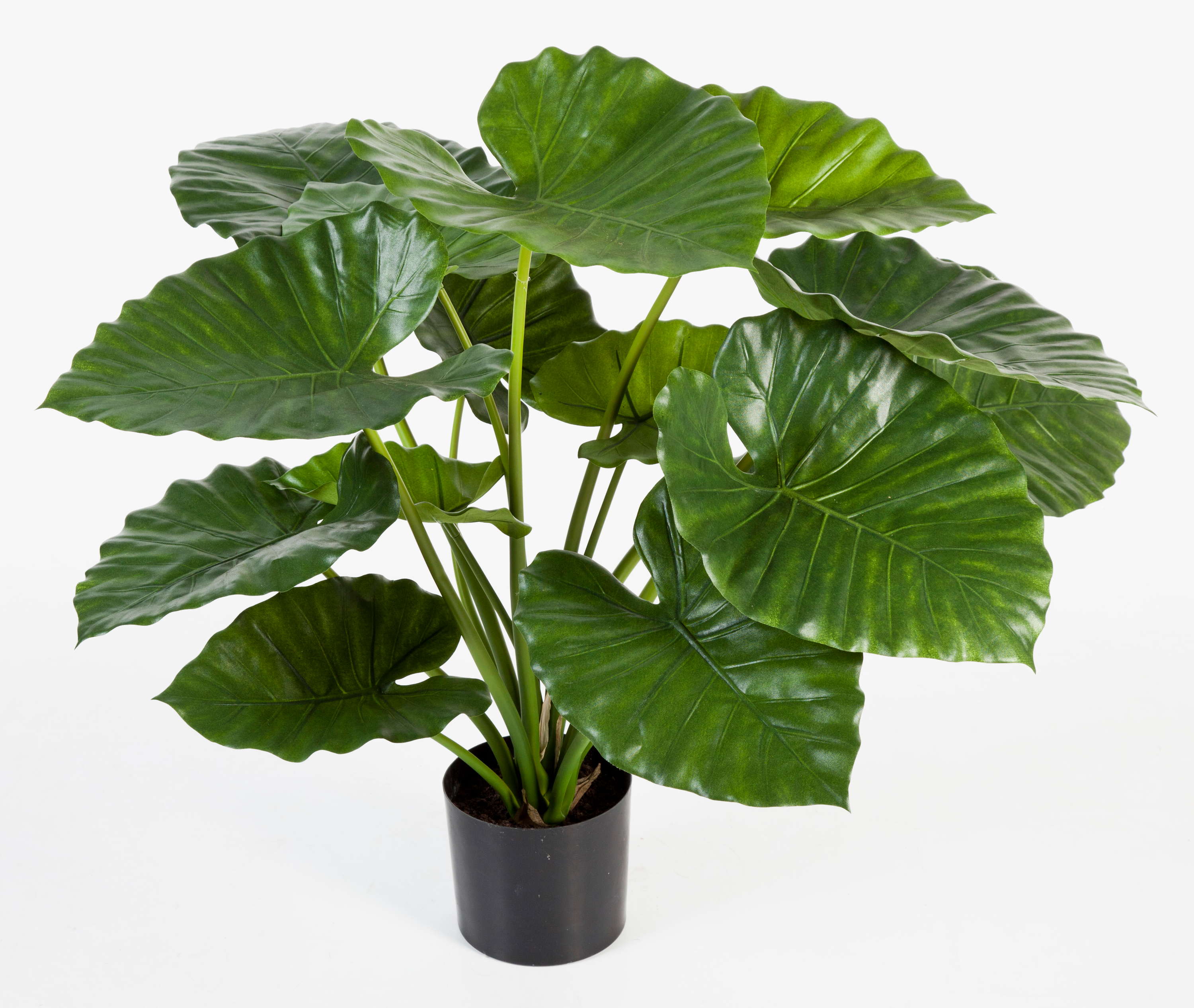 Alocasia calidora artificial con 15 hojas verdes en forma de flecha. La planta posee una altura aproximada de 75 cm y se entrega en maceta de cemento.