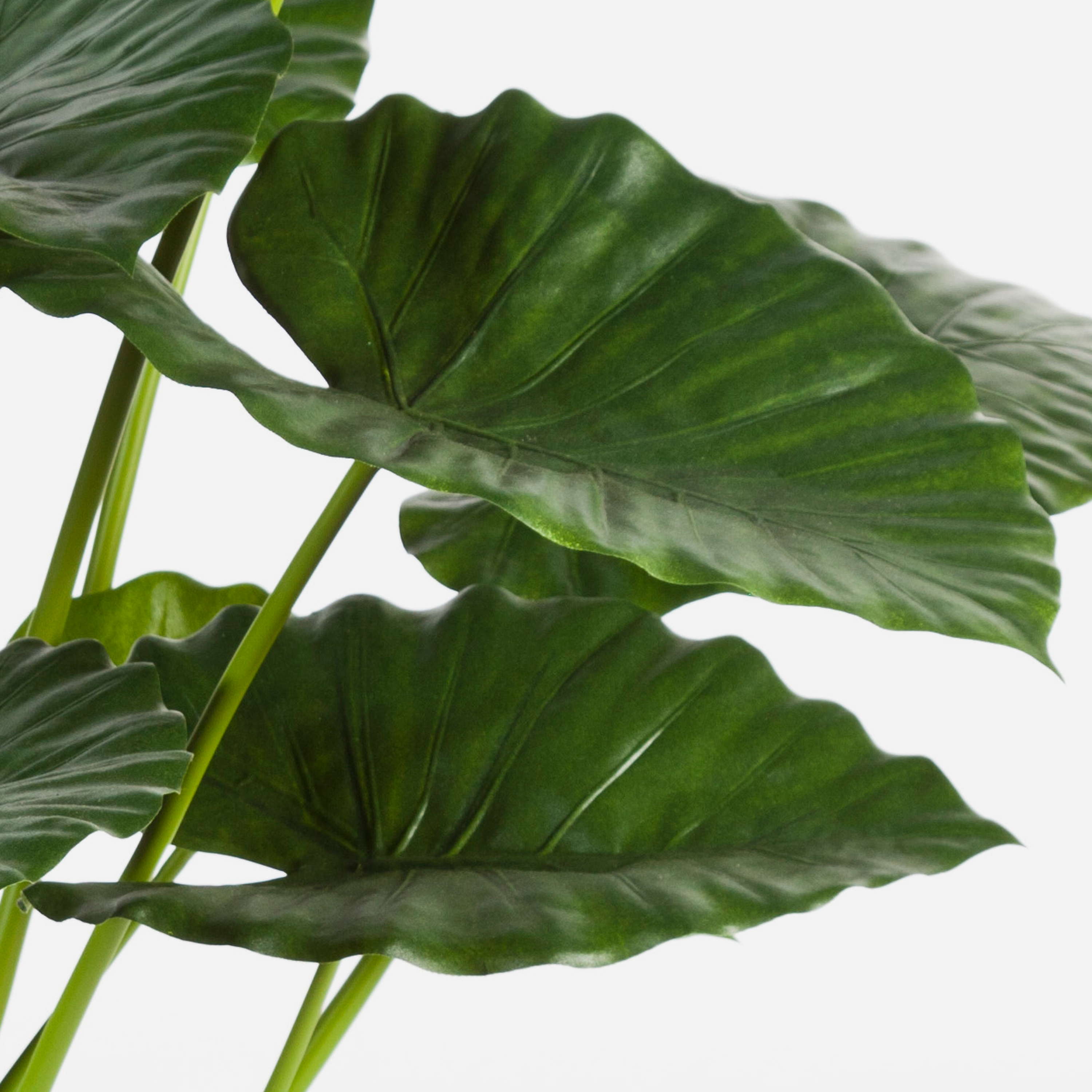 Alocasia calidora artificial con 19 verdes hojas en forma de flecha. La planta posee una altura aproximada de 95 cm y se entrega en maceta de cemento.
