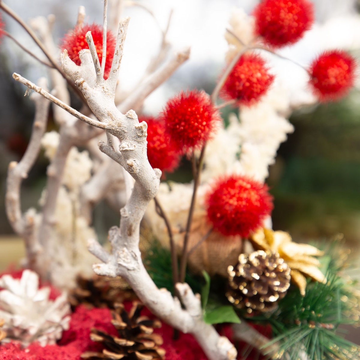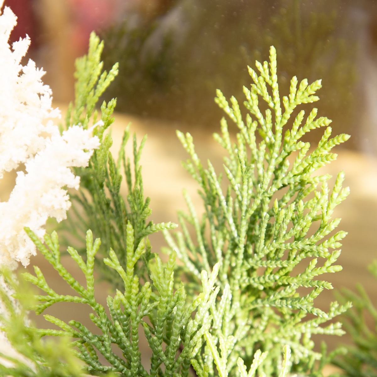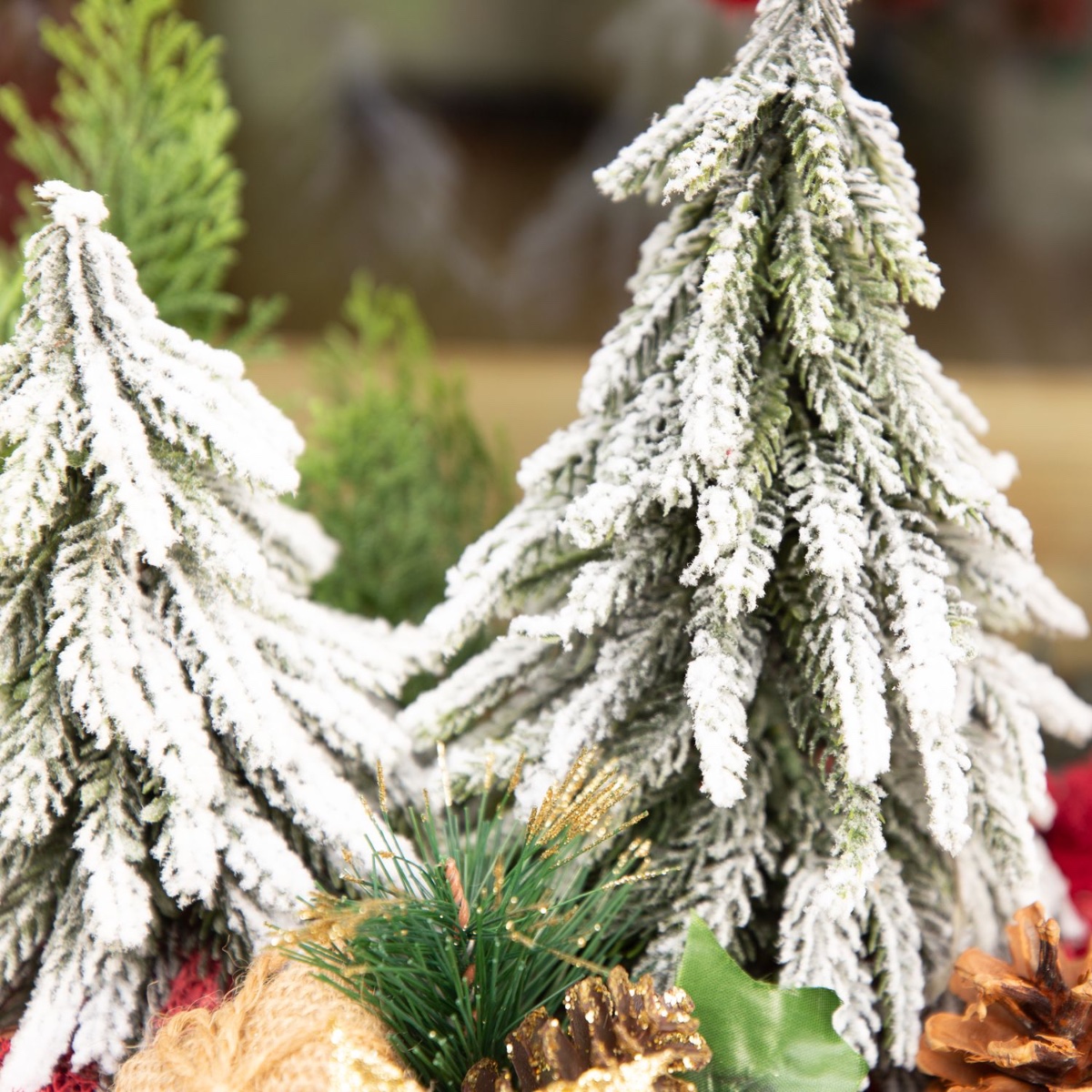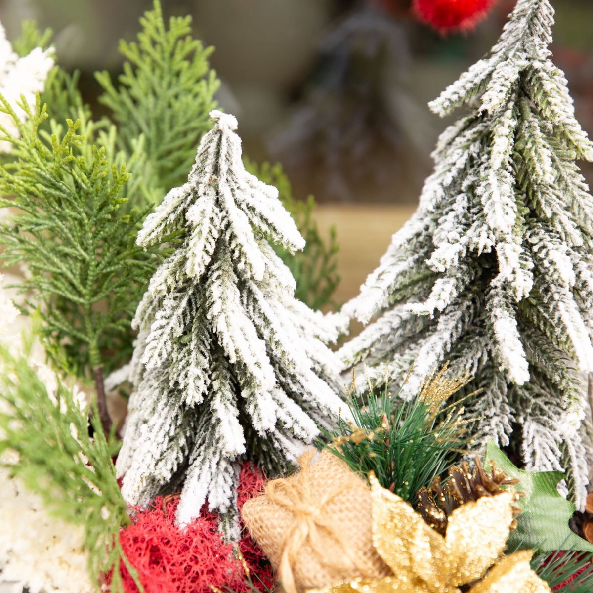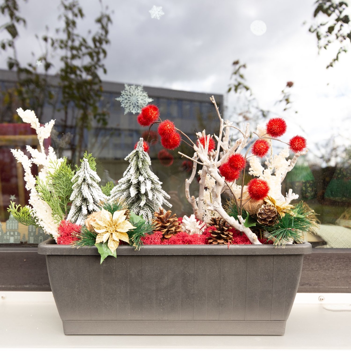 ¡Rojo, blanco y verde! Nuestras jardineras son ideales para crear una bonita decoración acorde con la estación del año. En esta jardinera hemos creado un pequeño mundo invernal que ilumina el sombrío tiempo invernal con elementos de color rojo brillante. Dos pequeños abetos nevados llaman la atención, sobre todo cuando se colocan sobre un musgo natural de color rojo brillante. La rama de bola de nieve roja combina a la perfección, ya que parece una bola de Navidad que cuelga de las ramas. Si tienes niños, puedes esconder un pequeño Papá Noel en este dulce mundo y ver quién lo encuentra primero. ¡Compra el look!