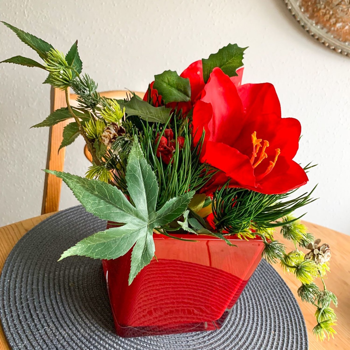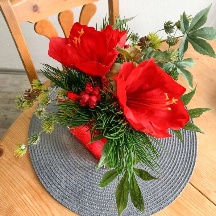 Brillo invernal en un cuadrado rojo: ¡pura elegancia con amarilis! Un moderno arreglo floral invernal que combina elegancia y festividad: la majestuosa amarilis se eleva orgullosa desde un cubo de cristal rojo intenso que le proporciona un marco elegante. El intenso contraste de colores entre el rojo brillante y el verde fresco aporta calidez invernal a cualquier ambiente. Una sencillez sofisticada que encanta tanto como decoración de mesa como elegante regalo. ¡Compra este look!