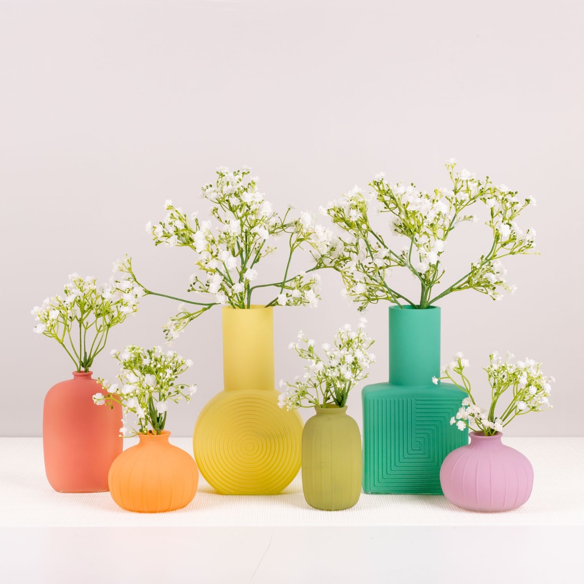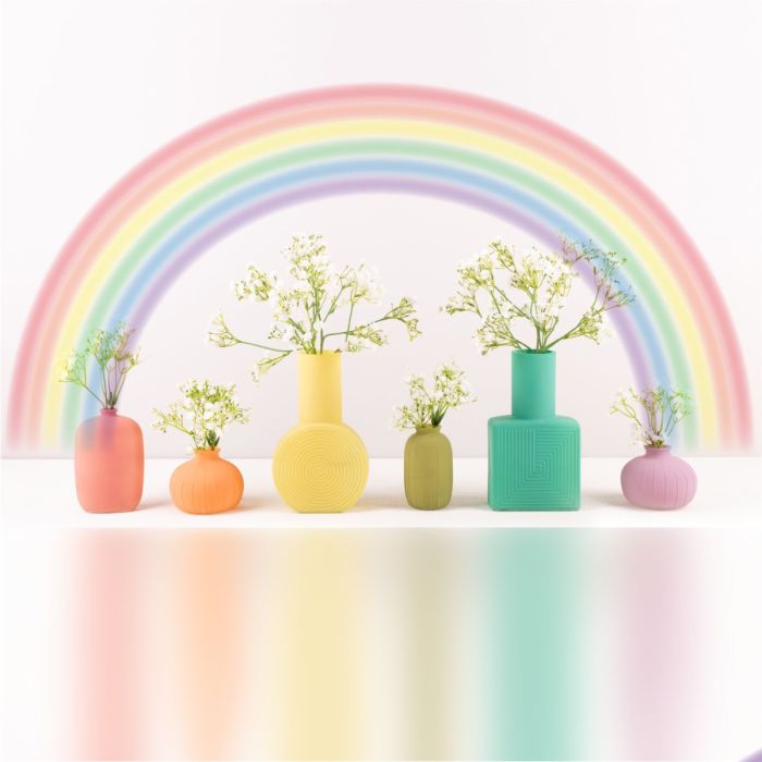 ¡Los colores del arco iris! El mundo es colorido y nuestra empresa también. Y no nos referimos sólo a nuestra colorida gama, sino a todo el equipo. No importa de dónde vengas, qué te guste o qué fe sigas, en artplants todos somos iguales. La superficie mate y los delicados colores pastel de estas botellas pueden combinarse maravillosamente para crear un arco iris de colores. Un poco de gypsophila como accesorio y la decoración de la mesa estará lista, por ejemplo, para un banquete de boda entre personas del mismo sexo. Compra el look!