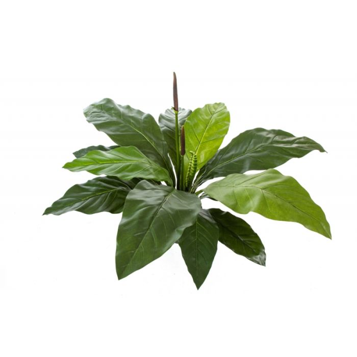 Anturio decorativo HAILEY con 2 capullos y 17 hojas, también conocido como flor de flamenco y anthurium. La planta de plástico viene en una maceta de cemento para facilitar su colocación en su jardinera.