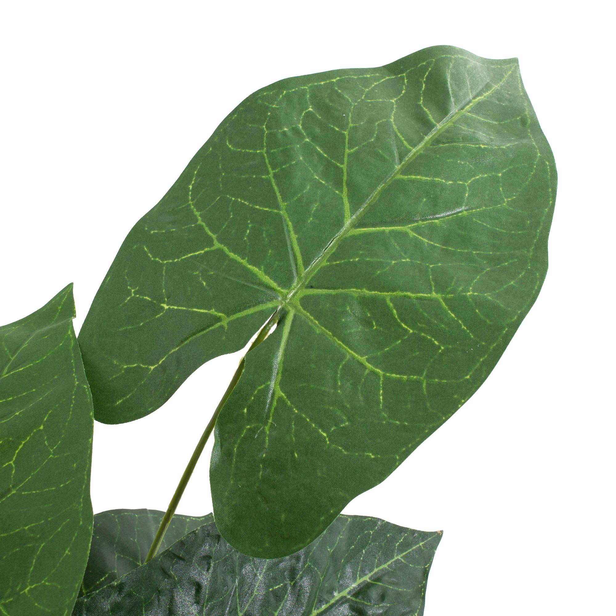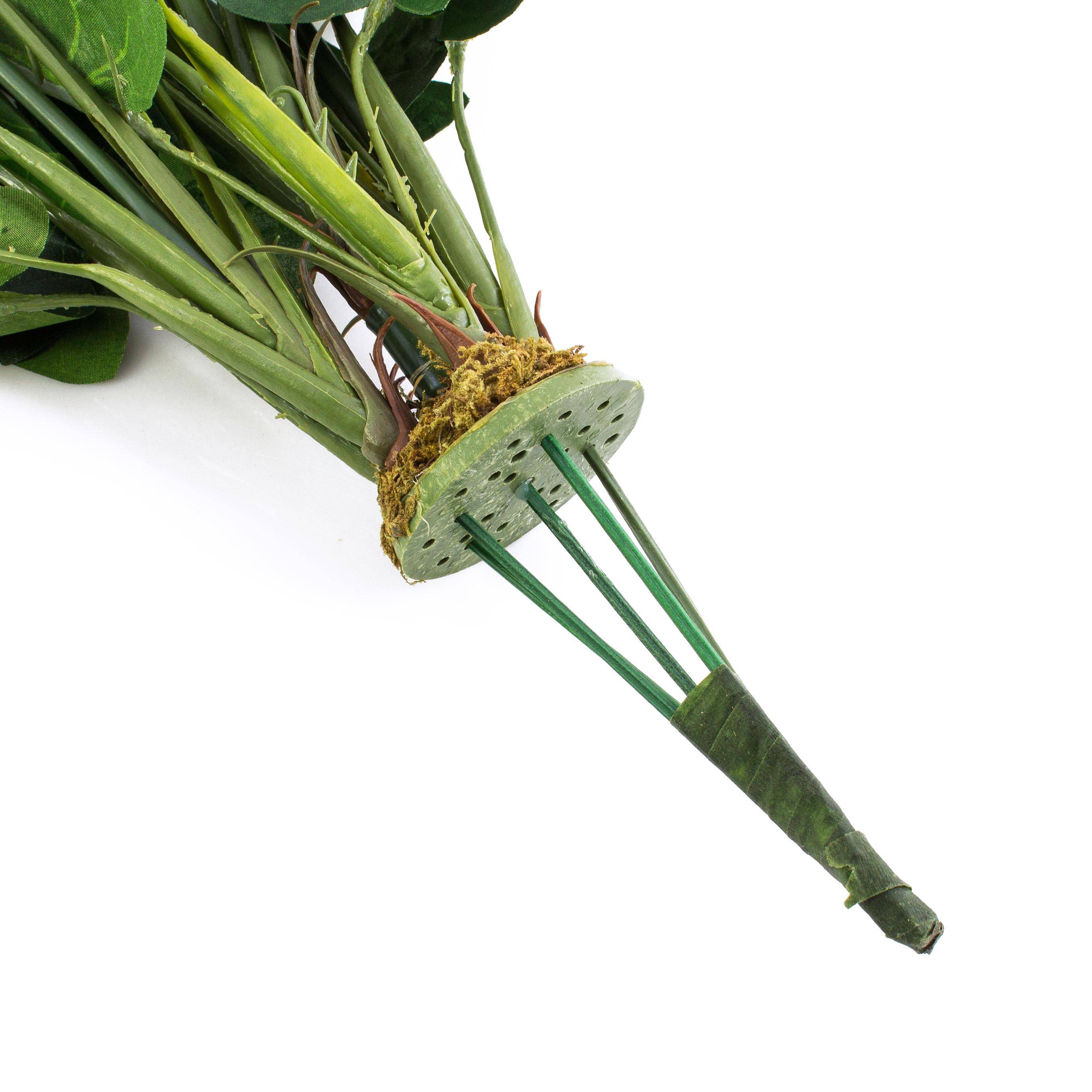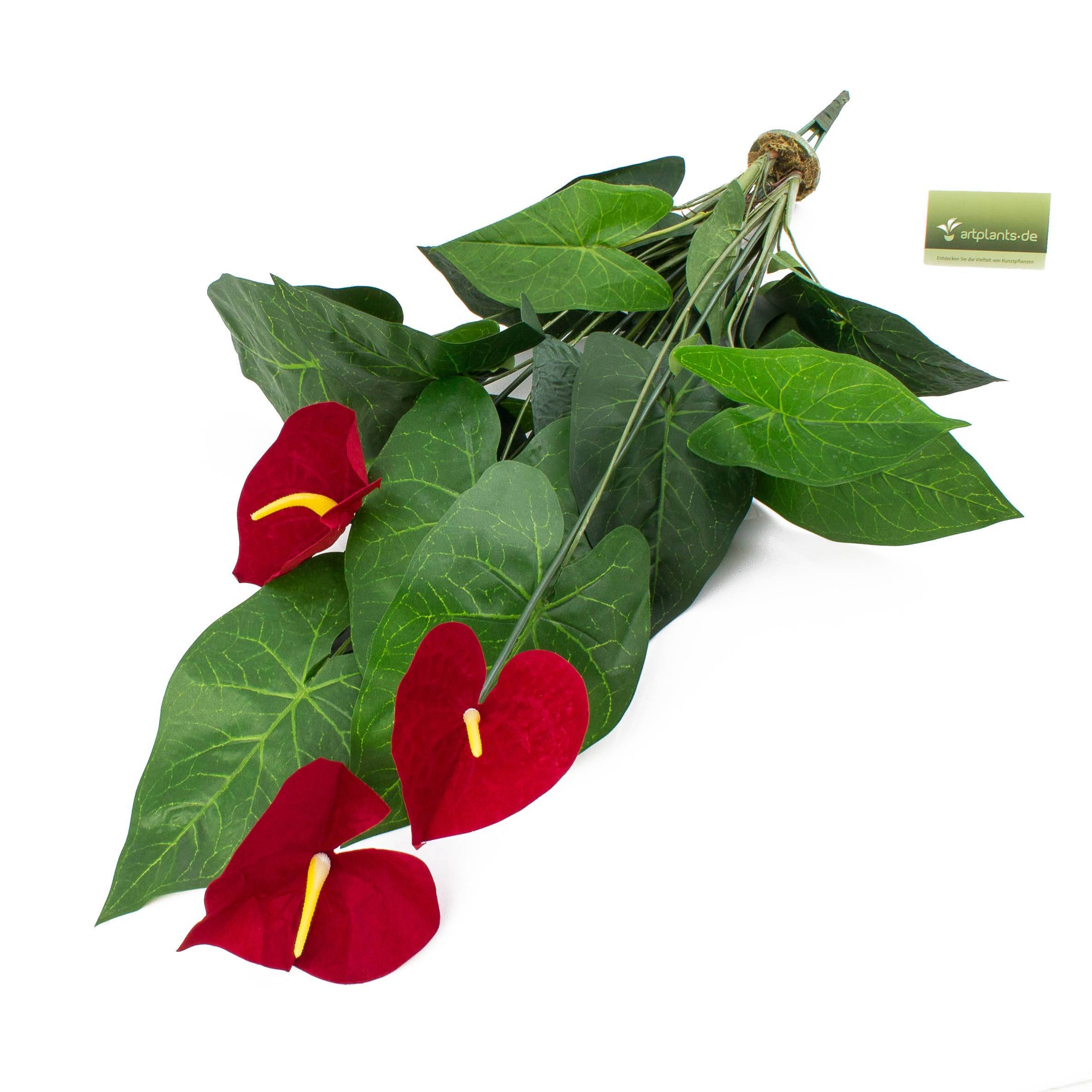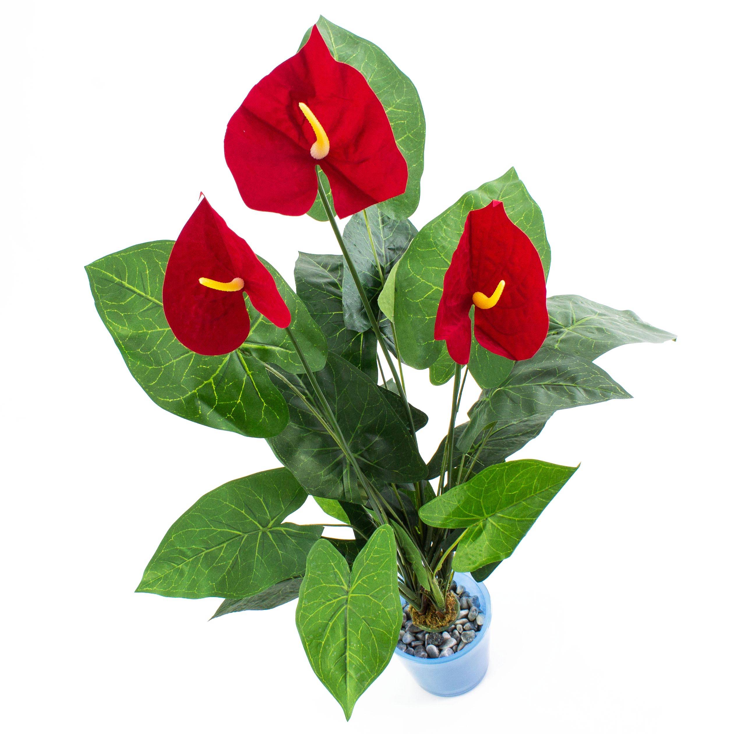Anturio fiel de aspecto natural con 3 flores rojas. El Anturio artificial es de unos 80 cm de alto y tiene alrededor de 25 hojas.