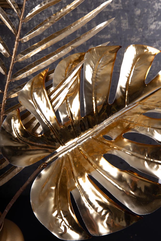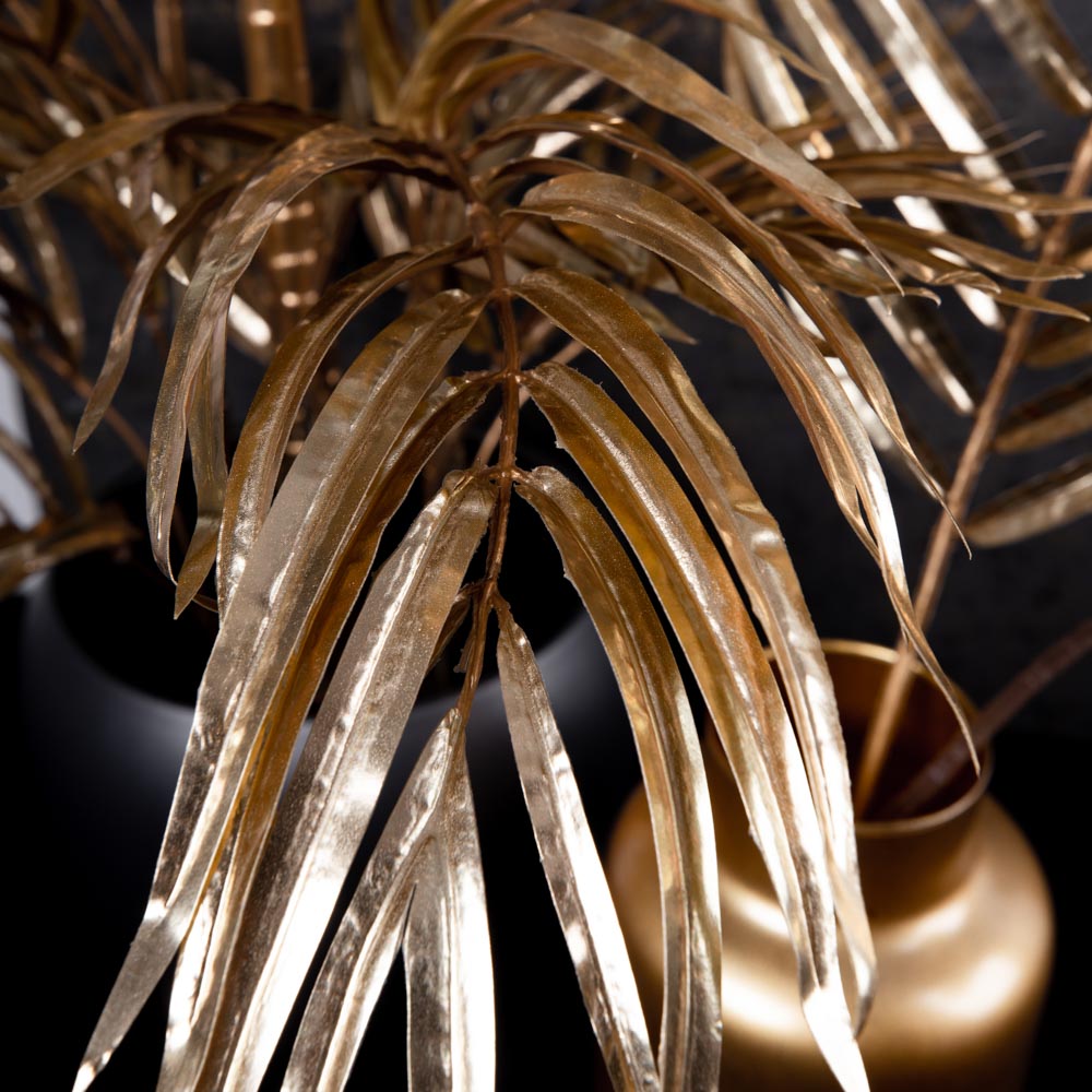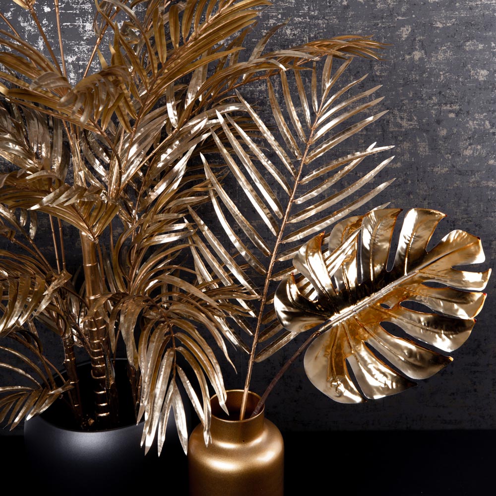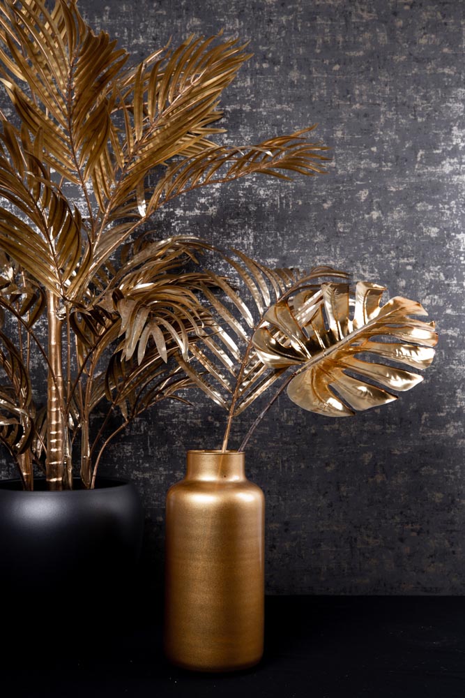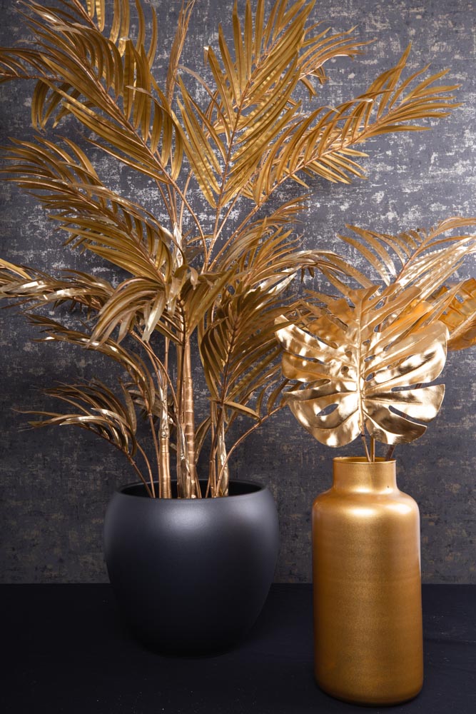 ¡Negro y dorado! ¡Nuestra variedad de plantas de imitación doradas es totalmente inspiradora! Para este look, nos decantamos por un diseño clásico que realmente encaja en cualquier salón. Una palmera en una maceta antracita combinada con un jarrón dorado, que se equipó con una hoja de filodendro y una hoja de palmera. Sencillo, atemporal y bonito. Compra el look!