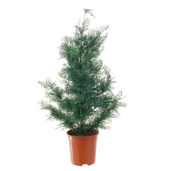 El cedro decorativo ELIANE tiene numerosas agujas verdes y se suministra en una maceta interior, para la decoración de un hotel, una tienda o una oficina.