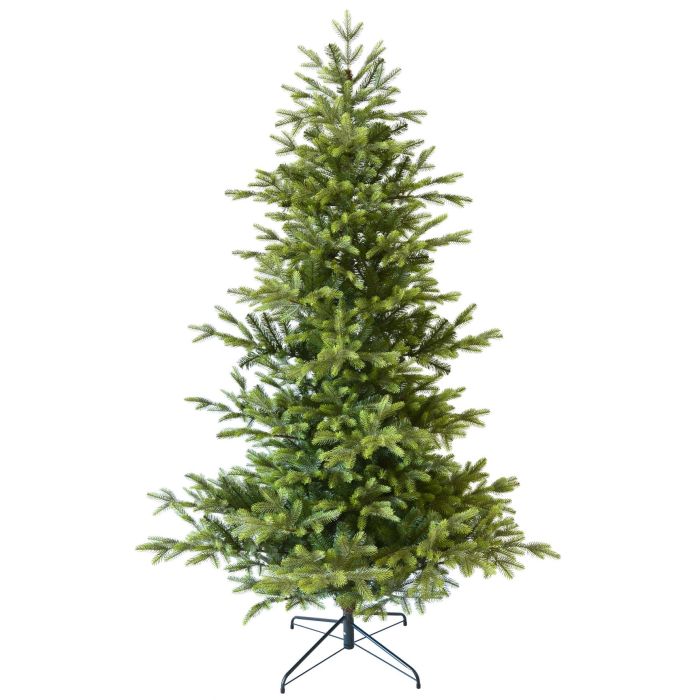 Árbol de plástico/Abeto falso TURIN de color verde con soporte de metal y ramas de aguja de PE/PVC. El abeto artificial de Navidad posee una altura de aprox. 210 cm, un diámetro de aprox. 140 cm y es ideal como decoración para el salón de casa o para restaurantes, escaparates, puestos de feria, etc.
