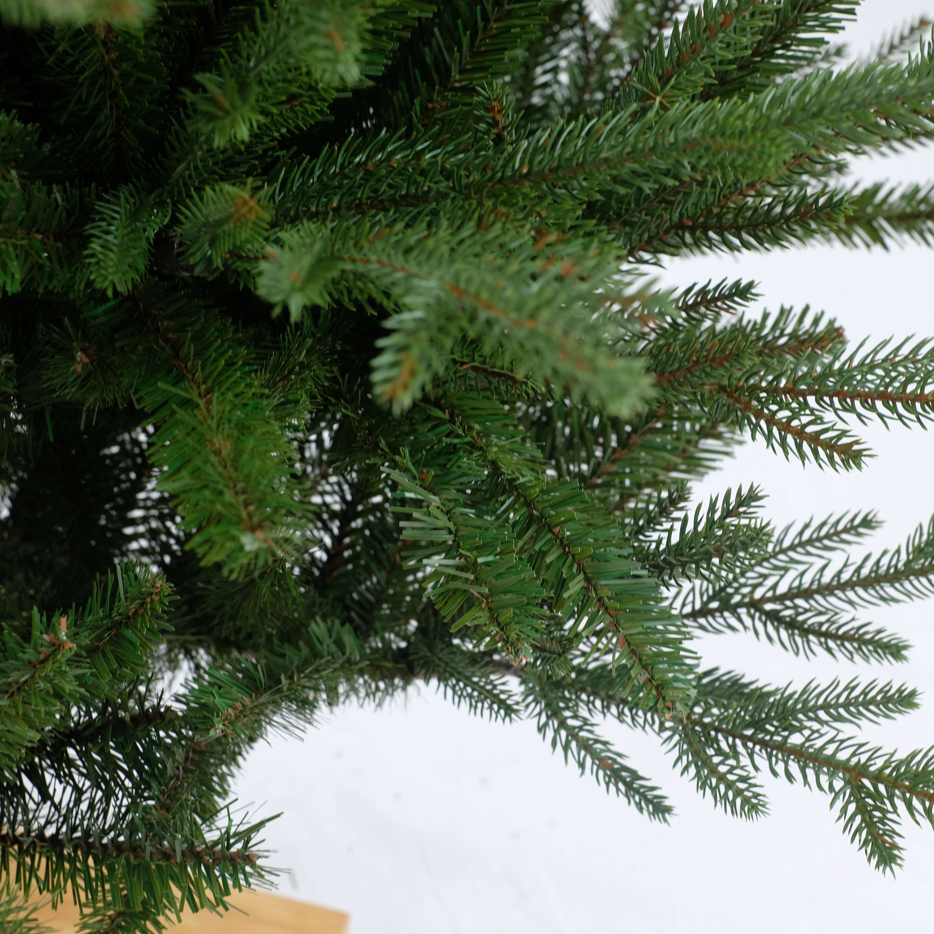 Abeto decorativo/Árbol de Navidad artificial TIRANA de color verde con soporte de madera y ramas de aguja de PE/PVC. El abeto artificial de Navidad posee una altura de aprox. 230 cm, un diámetro de aprox. 150 cm y es ideal como decoración para el salón de casa o para restaurantes, escaparates, puestos de feria, etc.