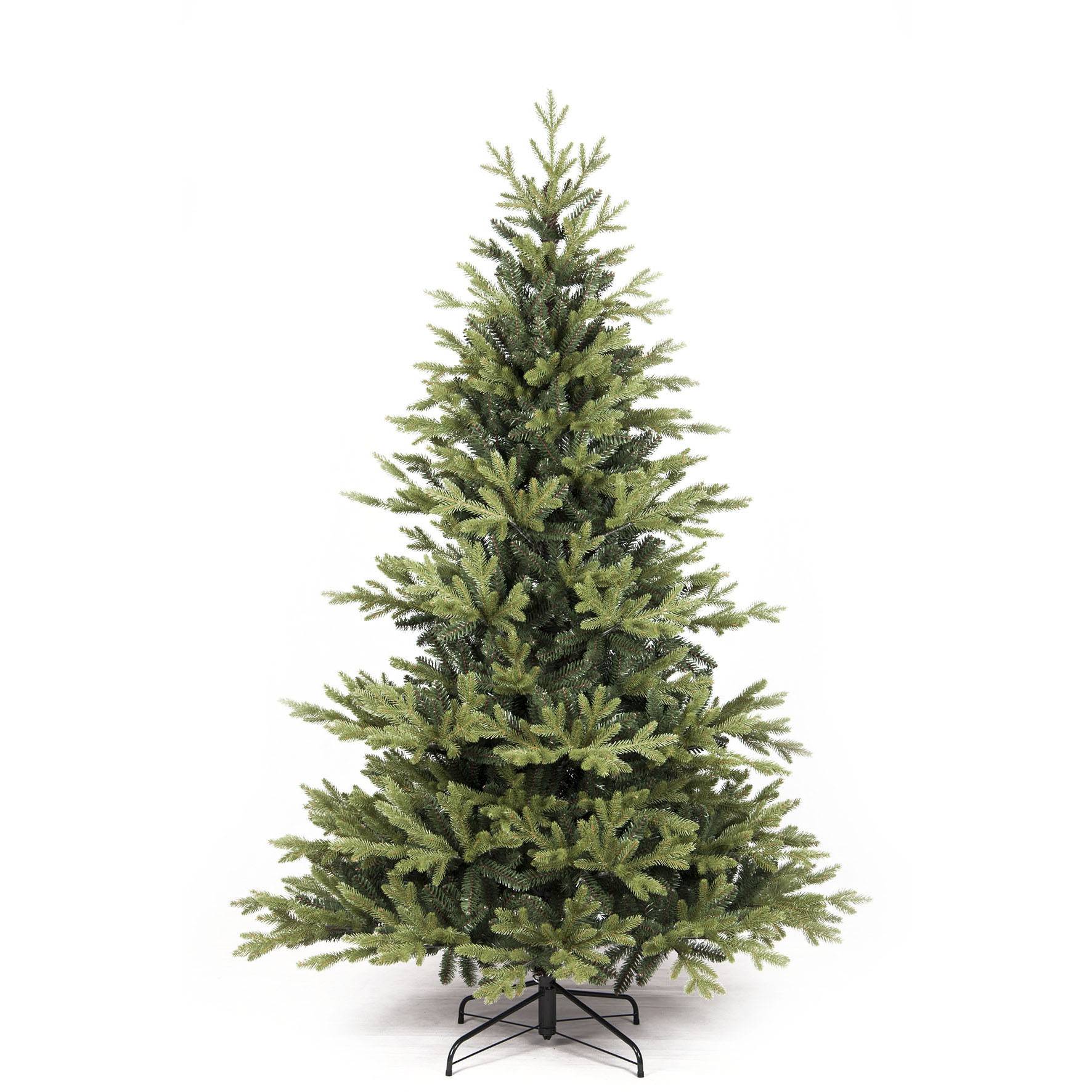 Árbol de Navidad de plástico/Abeto navideño GRAZ de color verde con soporte de metal y ramas de aguja de PE/PVC. El abeto artificial de Navidad posee una altura de aprox. 210 cm, un diámetro de aprox. 130 cm y es ideal como decoración para el salón de casa o para restaurantes, escaparates, puestos de feria, etc.