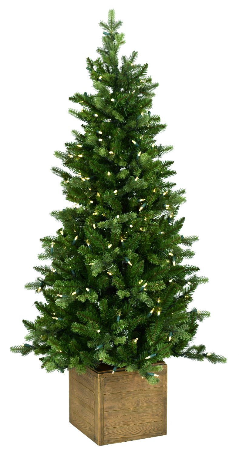 Árbol navideño/Abeto sintético OMAHA de color verde con caja decorativa de madera y ramas de aguja de PE/PVC. El abeto artificial de Navidad posee una altura de aprox. 135 cm, un diámetro de aprox. 65 cm y es ideal como decoración para el salón de casa o para restaurantes, escaparates, puestos de feria, etc.