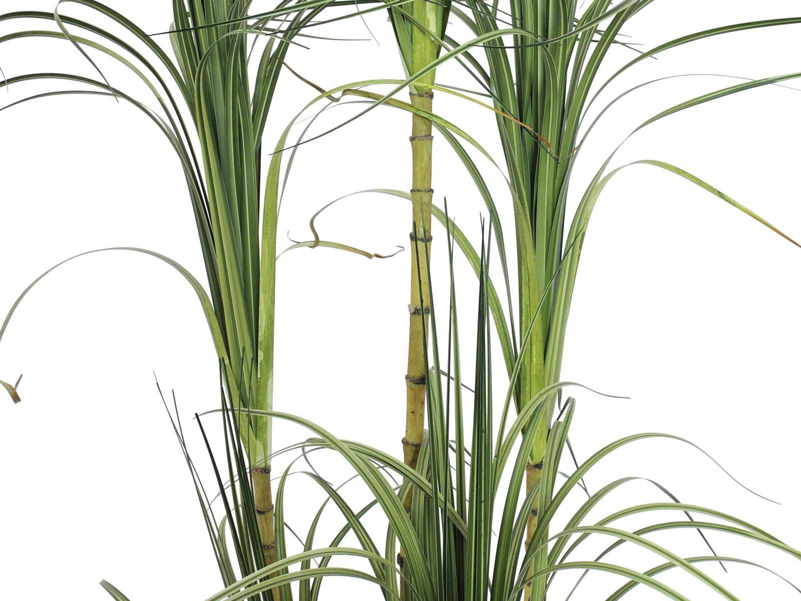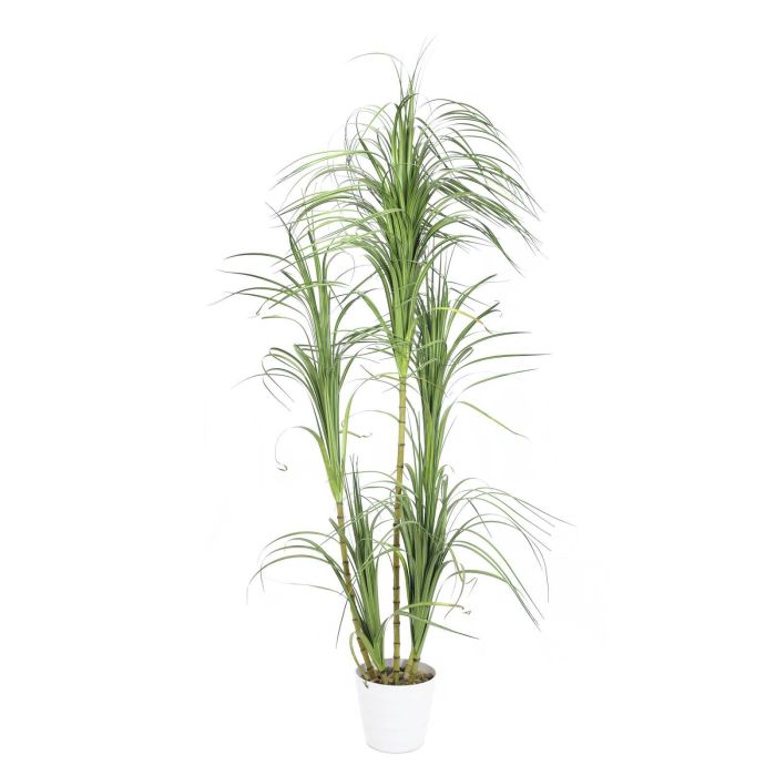 Bonita Drácena (Dracaena) artificial con muchos penachos de hierba en color verde. La planta artificial se entrega en maceta decorativa y tiene una altura total aproximada de 215 cm.