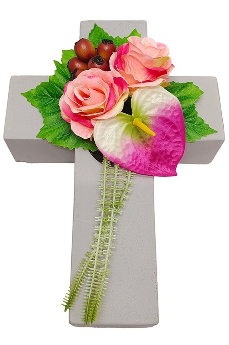 Arreglo artificial de rosa, anturio, escaramujo NINNA, cruz, rosa-fucsia-rojo, 30x18x11cm