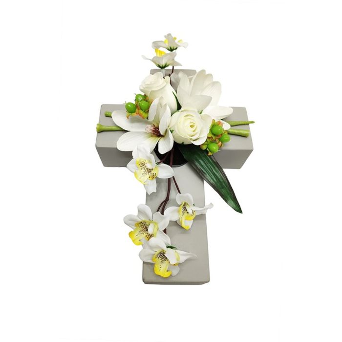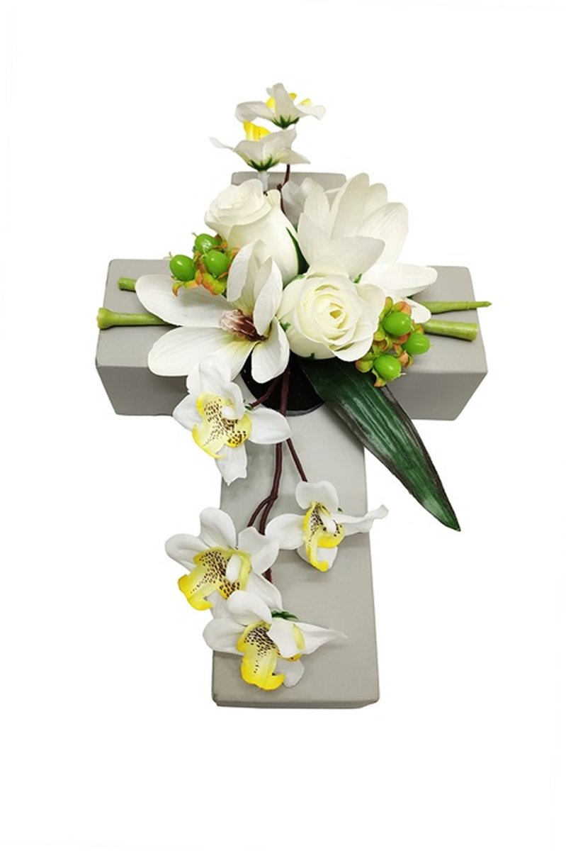 Arreglo de flores artificiales de magnolia, orquídea, rosa OVANA, cruz, blanco, 28x18x10cm