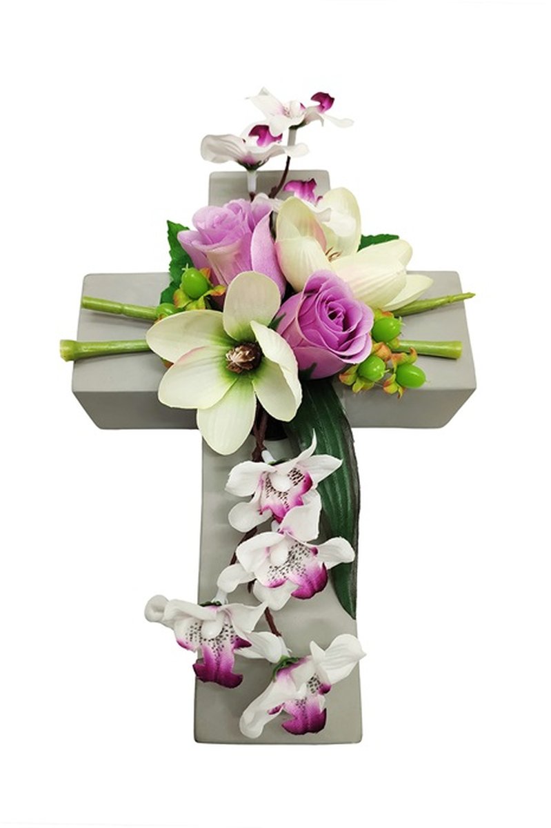 - El arreglo floral de buen gusto en una cruz es un hermoso enriquecimiento por ejemplo para la decoración de la tumba.Tenga en cuenta que no podemos garantizar la longevidad y la durabilidad para el uso al aire libre, las flores artificiales pueden decolorarse debido a la radiación UV, volverse quebradizas o arrancarse por el viento
