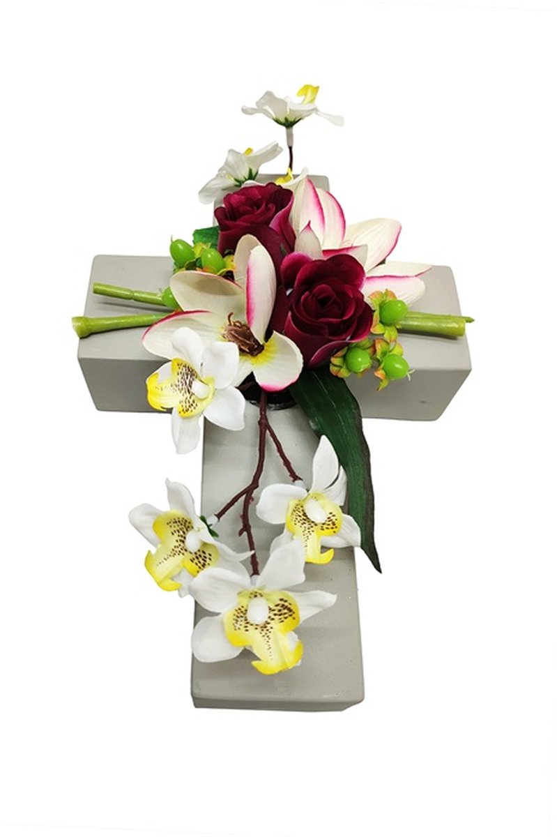 - El arreglo floral de buen gusto en una cruz es un hermoso enriquecimiento por ejemplo para la decoración de la tumba.Tenga en cuenta que no podemos garantizar la longevidad y la durabilidad para el uso al aire libre, las flores artificiales pueden decolorarse debido a la radiación UV, volverse quebradizas o arrancarse por el viento