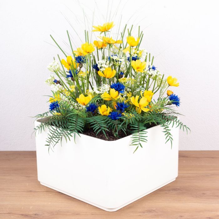 ¡Tu proyecto es nuestro desafío! Especialmente cuando la tarea no pone límites a la creatividad. Jörg vino desde muy lejos para traernos las macetas que íbamos a llenar con nuestras plantas artificiales. También trajo algunas fotos de su casa porque quería que el color combinara. El amarillo señal y el azul oscuro deberían ser los colores predominantes. En este arreglo, los colores favoritos de Jörg se implementaron perfectamente y se combinaron para crear un arreglo armonioso. Las Cosmea de color amarillo brillante, también conocidas como cosmos, no sólo tienen un aspecto bonito, sino que también tienen un significado maravilloso. ¡Defienden la paz! ¿Quién no quiere eso en su casa? Los acianos azules también tienen un simbolismo especial. Representan la belleza y la pureza. Esto le sienta muy bien a Jörg, que se esfuerza tanto en conseguir una casa bonita. ¡Compra el look!