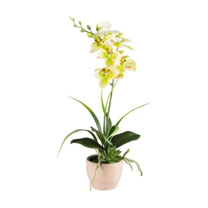 Arreglo floral artificial de orquídea y aeonium FININ, hierba, maceta de cemento, raíces, verde y blanco, 45 cm