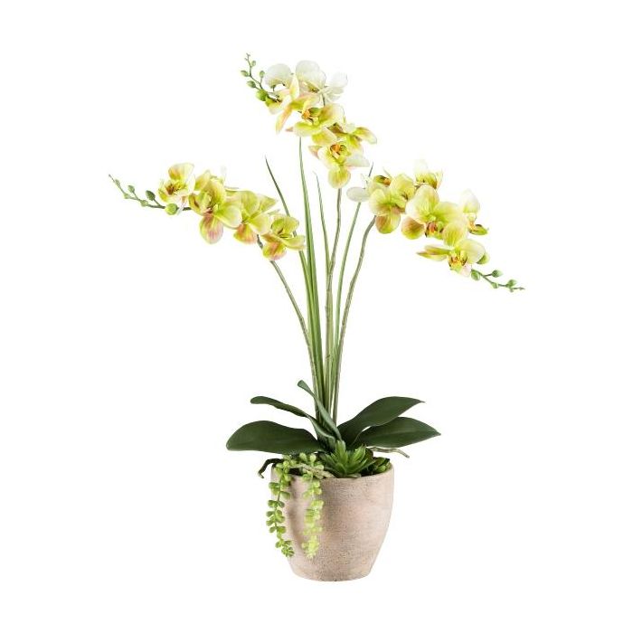 Arreglo floral artificial de orquídea y suculentas FININ, maceta de cemento, raíces, verde y blanco, 55 cm