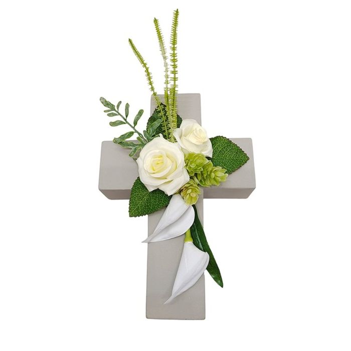- El arreglo floral de buen gusto en una cruz es un hermoso enriquecimiento por ejemplo para la decoración de la tumba, por favor tenga en cuenta que no podemos dar ninguna garantía para la longevidad y durabilidad para el uso al aire libre, las flores artificiales pueden decolorarse debido a la radiación UV, se vuelven frágiles o se desgarran por el viento!