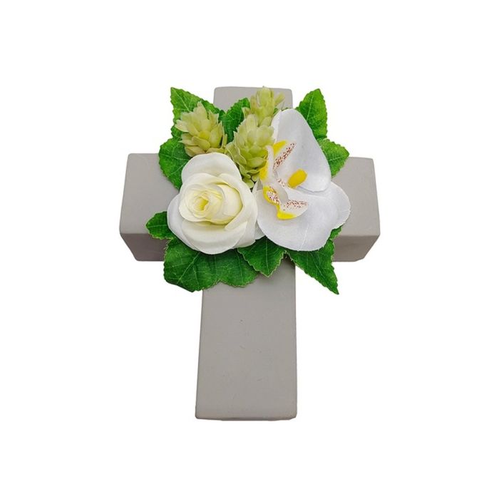 Arreglo floral artificial de Rosa, Orquídea, Lúpulo ARIADNA, cruz, blanco, 20x15x9cm