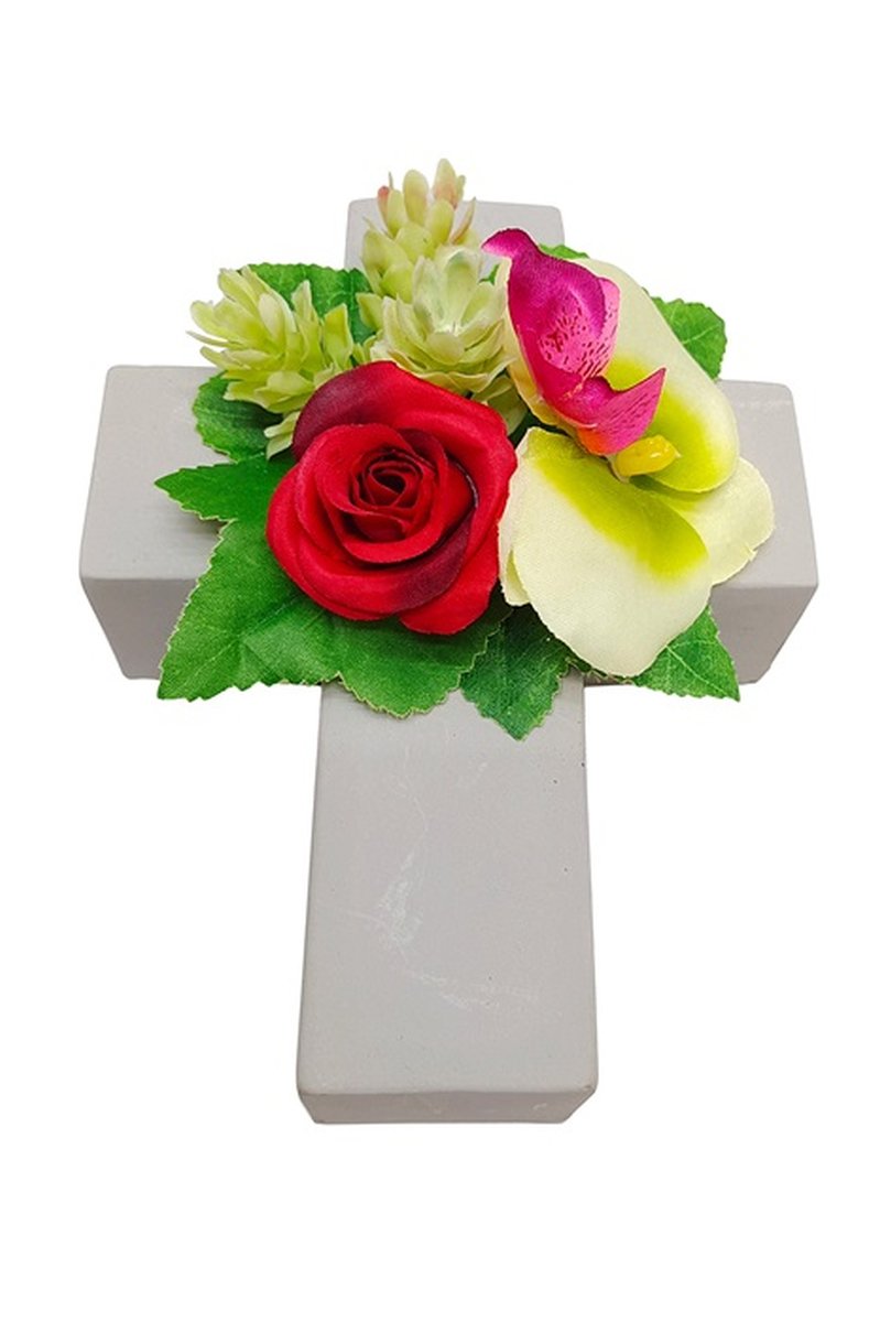 Arreglo floral artificial de Rosa, Orquídea, Lúpulo ARIADNA, cruz, rojo-verde-rosa, 20x15x9cm