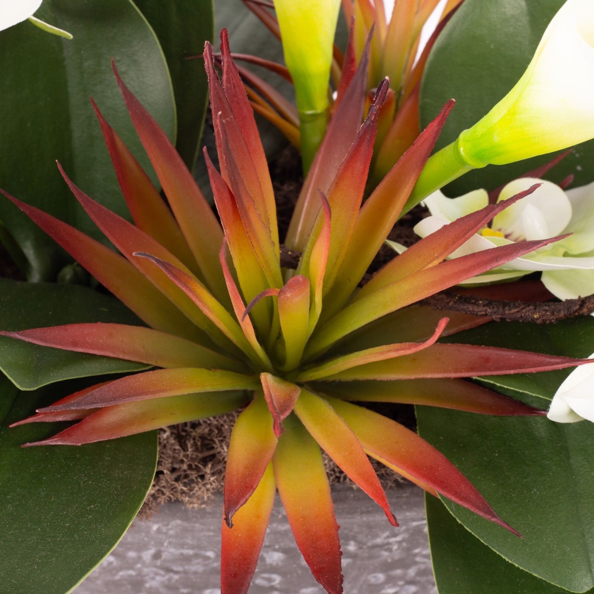 Un fascinante arreglo floral artificial que combina la elegancia exótica y la naturalidad moderna. Las brillantes flores de la strelitzia, con forma de pájaro, aportan un toque dinámico, mientras que las delicadas orquídeas aportan una ligereza romántica. Las curvas flores de cala aportan un toque elegante al arreglo, y las llamativas hojas de la agave aportan estructura y un toque de estilo desértico al diseño. Este arreglo es perfecto como elemento decorativo extraordinario para ocasiones especiales o como detalle artístico en salones modernos.