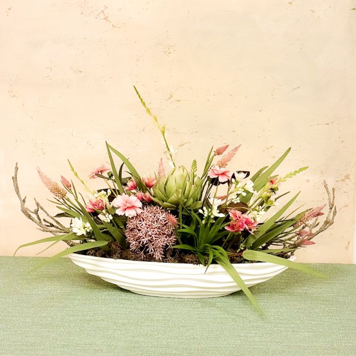 Consejo de diseño: Forra el cuenco con espuma floral y fíjala con pegamento si es necesario para que nada se deslice después. A continuación, pega las flores individualmente. Empezamos con la flor principal en el centro y pegamos una rama a cada lado. Así conseguimos un marco que pudimos ir rellenando poco a poco con más flores. Para terminar, decidimos utilizar musgo islandés seco y lo esparcimos bien entre cada uno de los tallos.