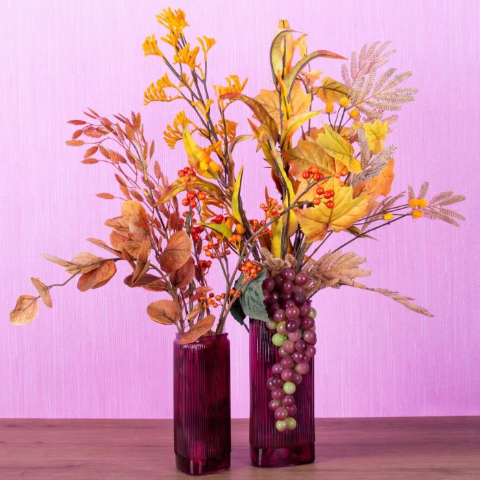 Consejo de diseño: Corta las ramas a diferentes longitudes y colócalas en los jarrones. Dobla algunas de las ramas hacia abajo para crear un bonito cuadro. El racimo de uvas también puede colocarse simplemente en el jarrón grande o sujetarse a una rama. Fácil de recrear!