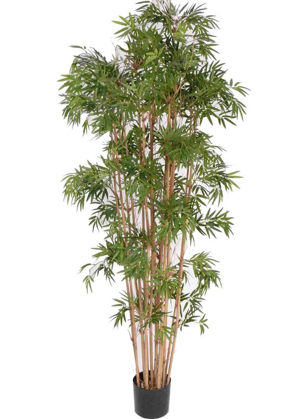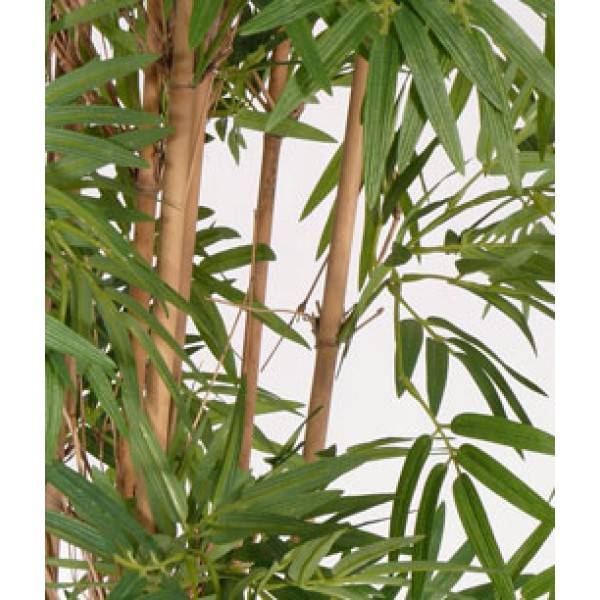 - Forma arbustiva con aprox. 3360 pequeñas hojas textiles en verde color, varios troncos finos de bambú reales