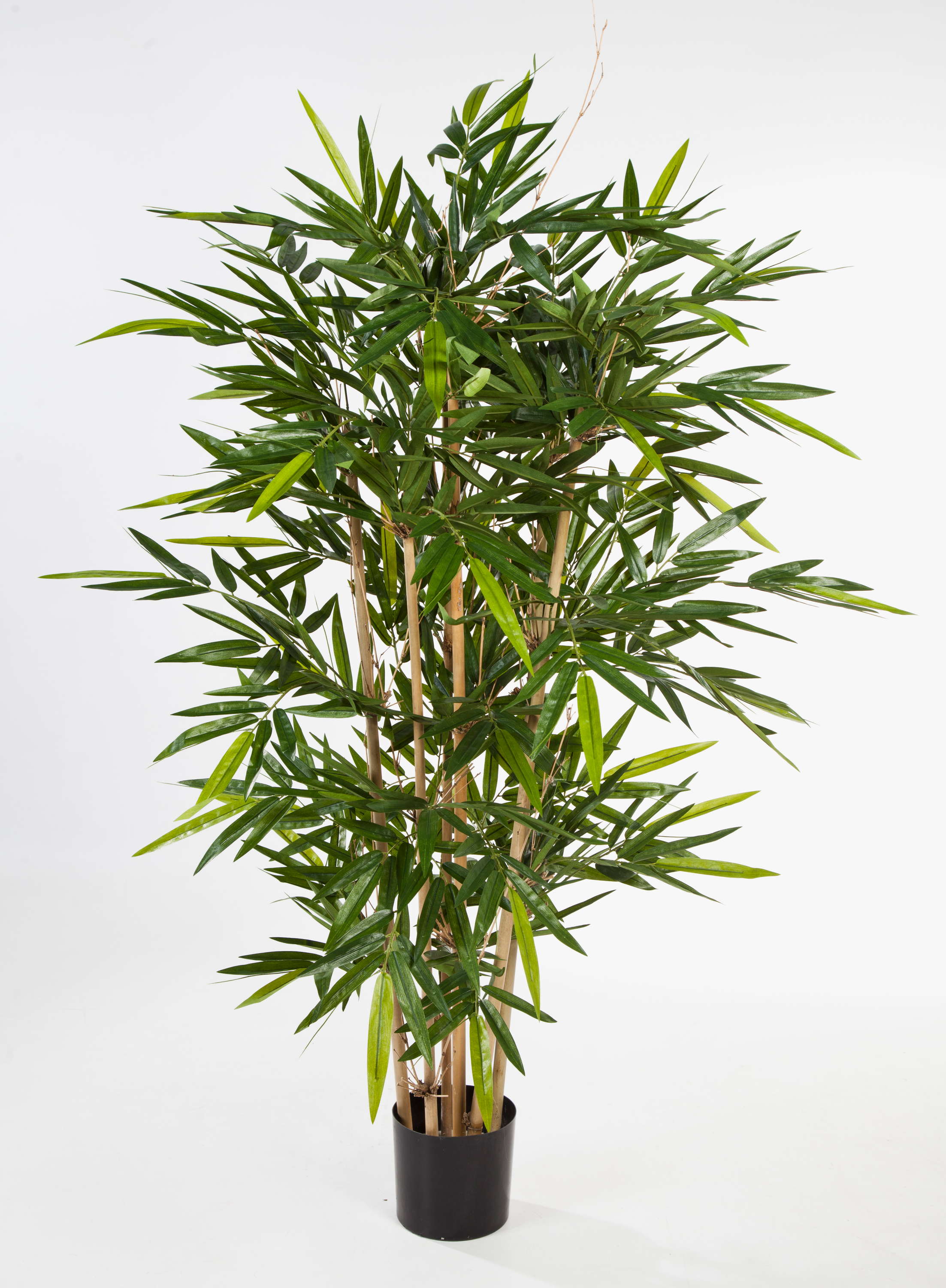 Bambú decorativo con varios troncos y cerca de 1215 hojas. La mata artificial mide un total aproximado de 180 cm de alto y se entrega en maceta.