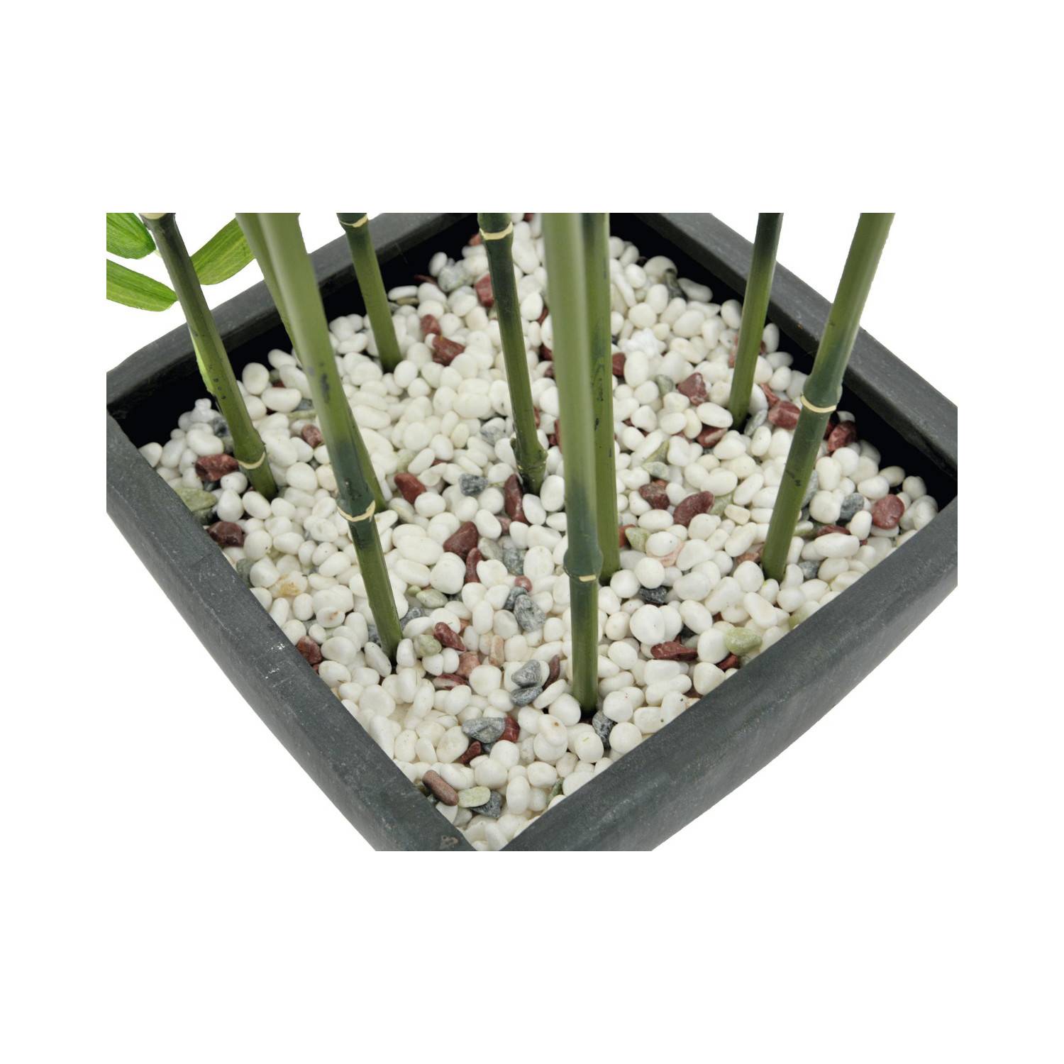 Bambú artificial con troncos artificiales oscuros en una maceta decorativa de color negro. El bambú consta de hojas de color verde claro y verde oscuro y mide un total aproximado de 120 cm de alto.