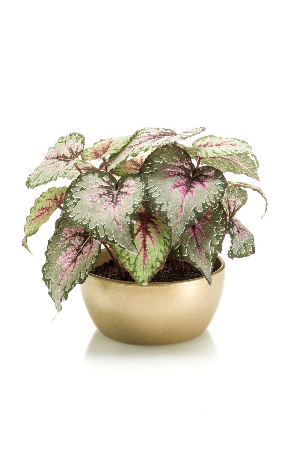 Begonia rex artificial KATRICE en cuenco de cerámica dorada, verde-violeta, 25cm