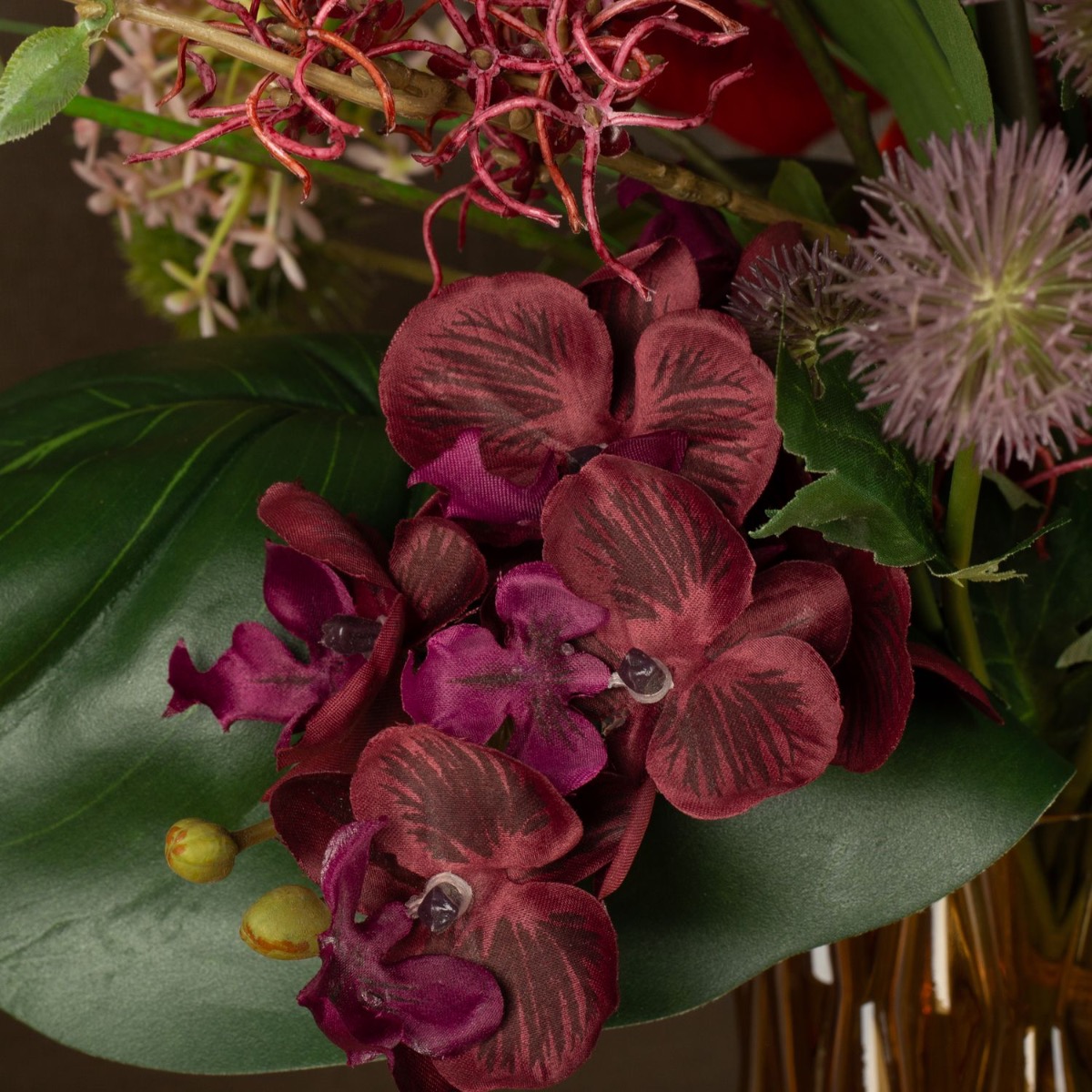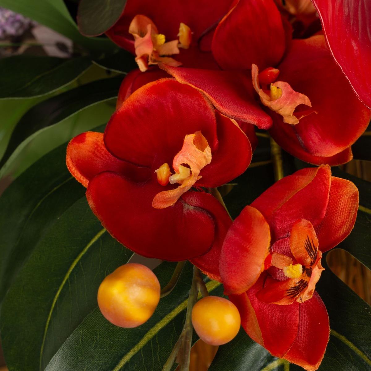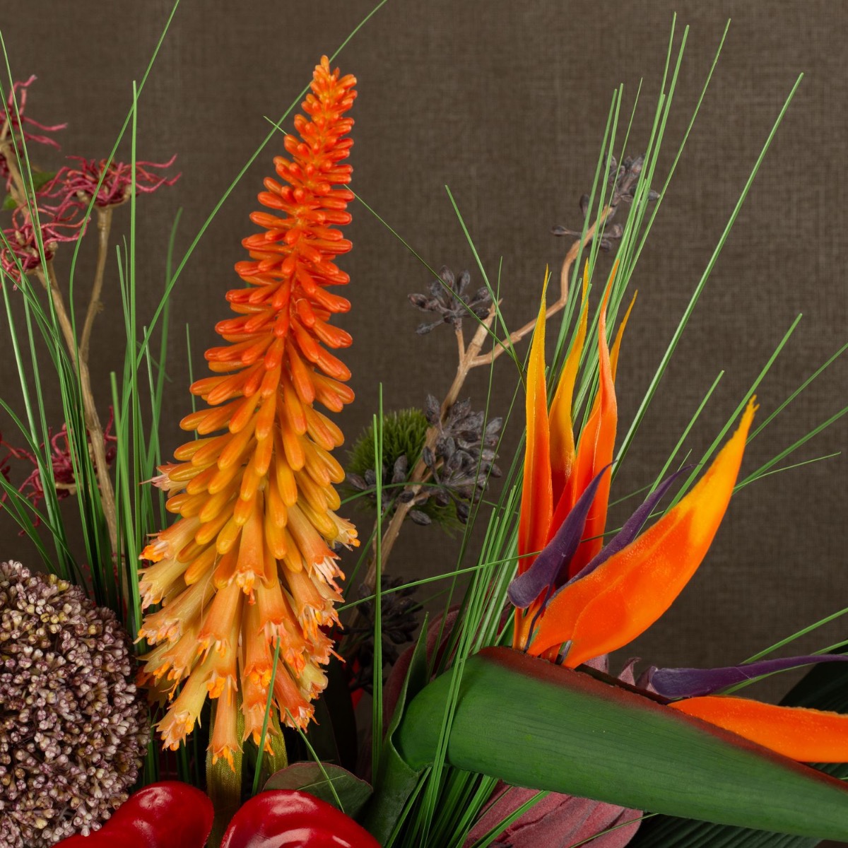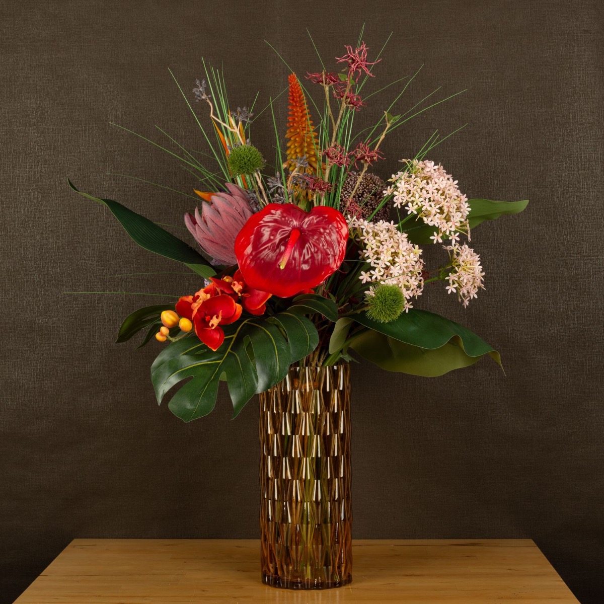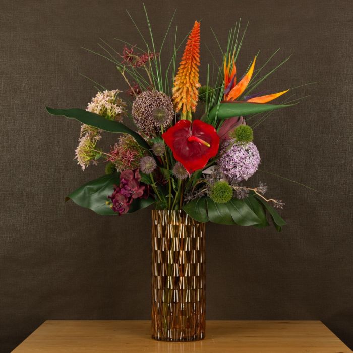 ¡Strelitzia y Monstera! Una combinación que hace que cada ramo parezca exótico. Anthurium, orquídeas y el kniphofia brillan en fuertes tonos rojos y naranjas y dan vida al color. El jarrón amarillo anaranjado crea con su estructura crea un extraordinario juego de luces y hace brillar el ramo ¡Compra el look!