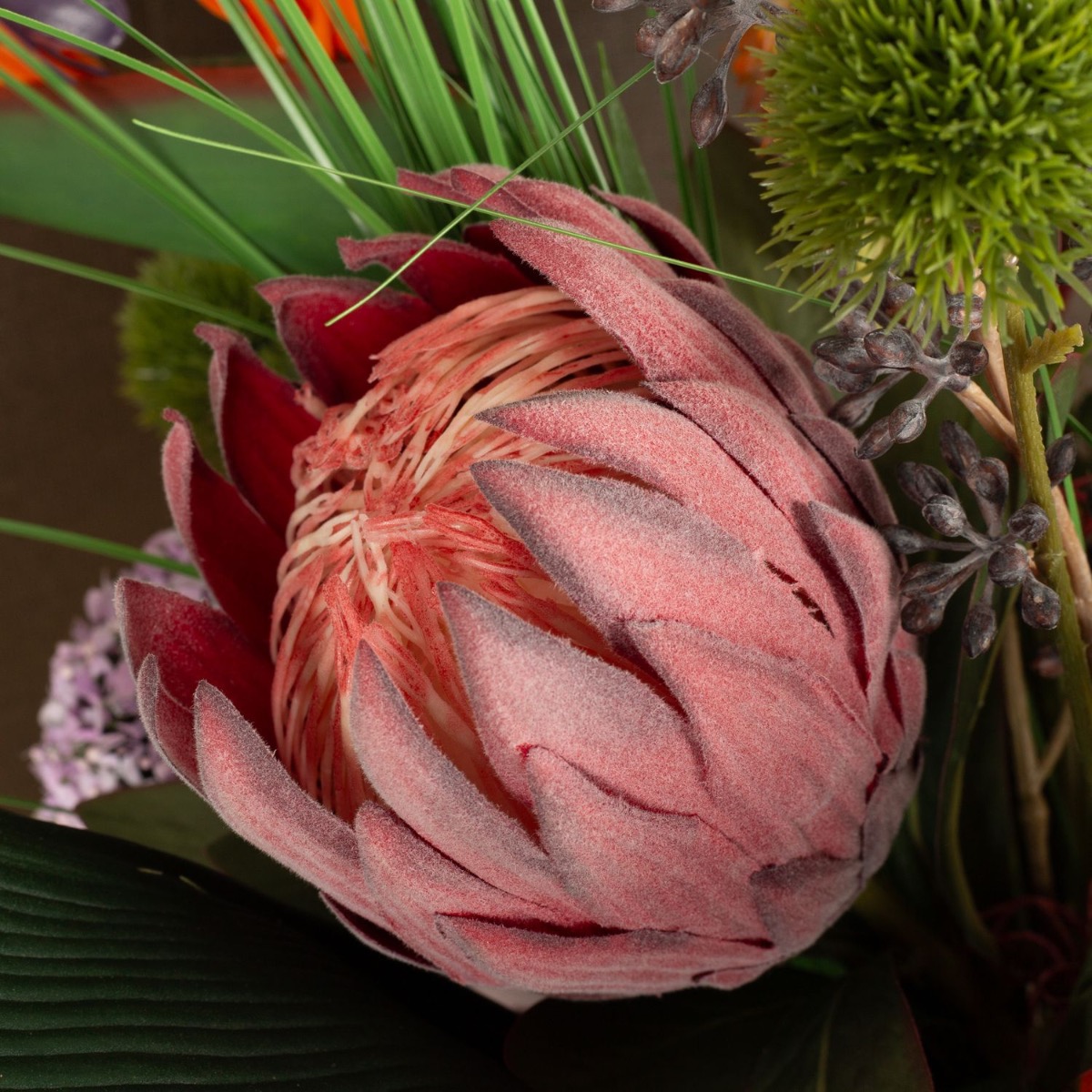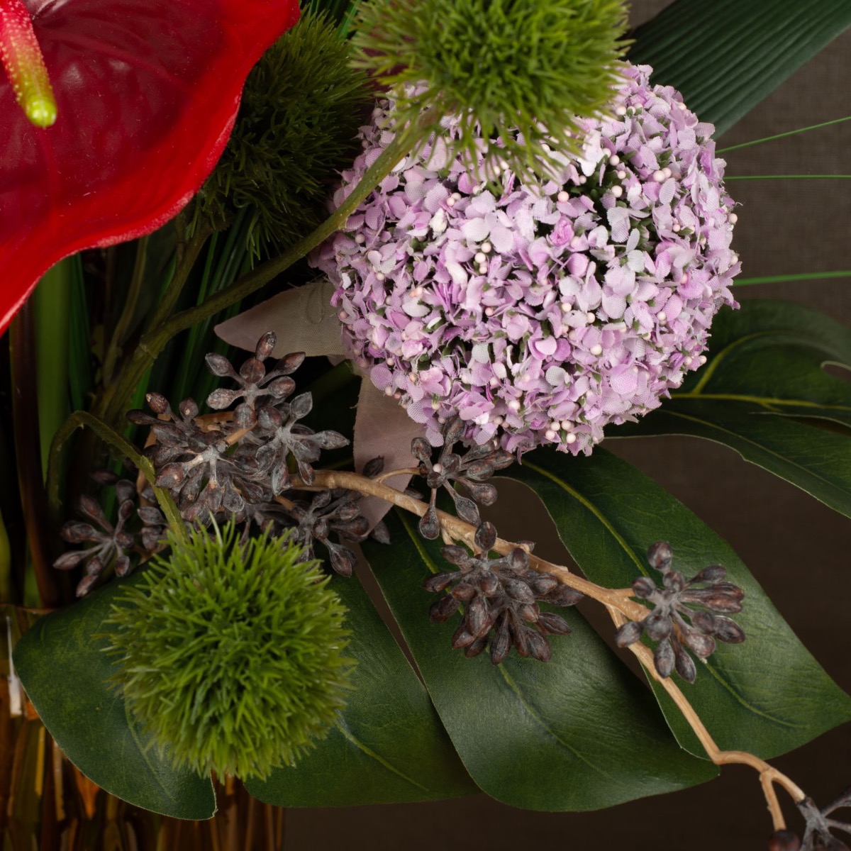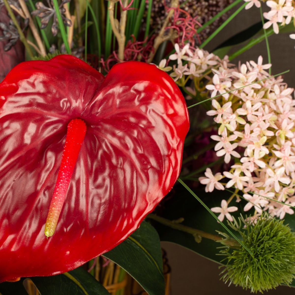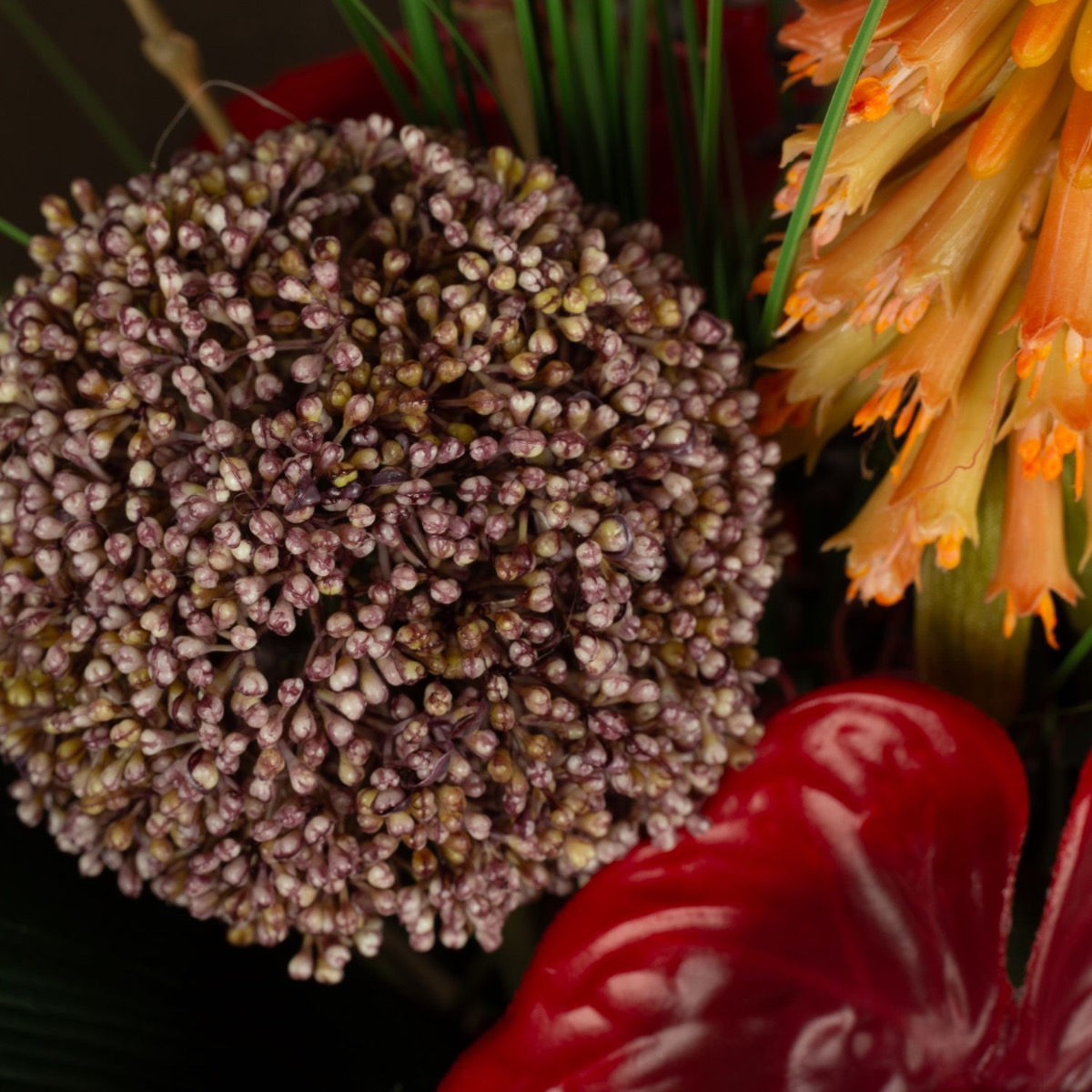 ¡Strelitzia y Monstera! Una combinación que hace que cada ramo parezca exótico. Anthurium, orquídeas y el kniphofia brillan en fuertes tonos rojos y naranjas y dan vida al color. El jarrón amarillo anaranjado crea con su estructura crea un extraordinario juego de luces y hace brillar el ramo ¡Compra el look!