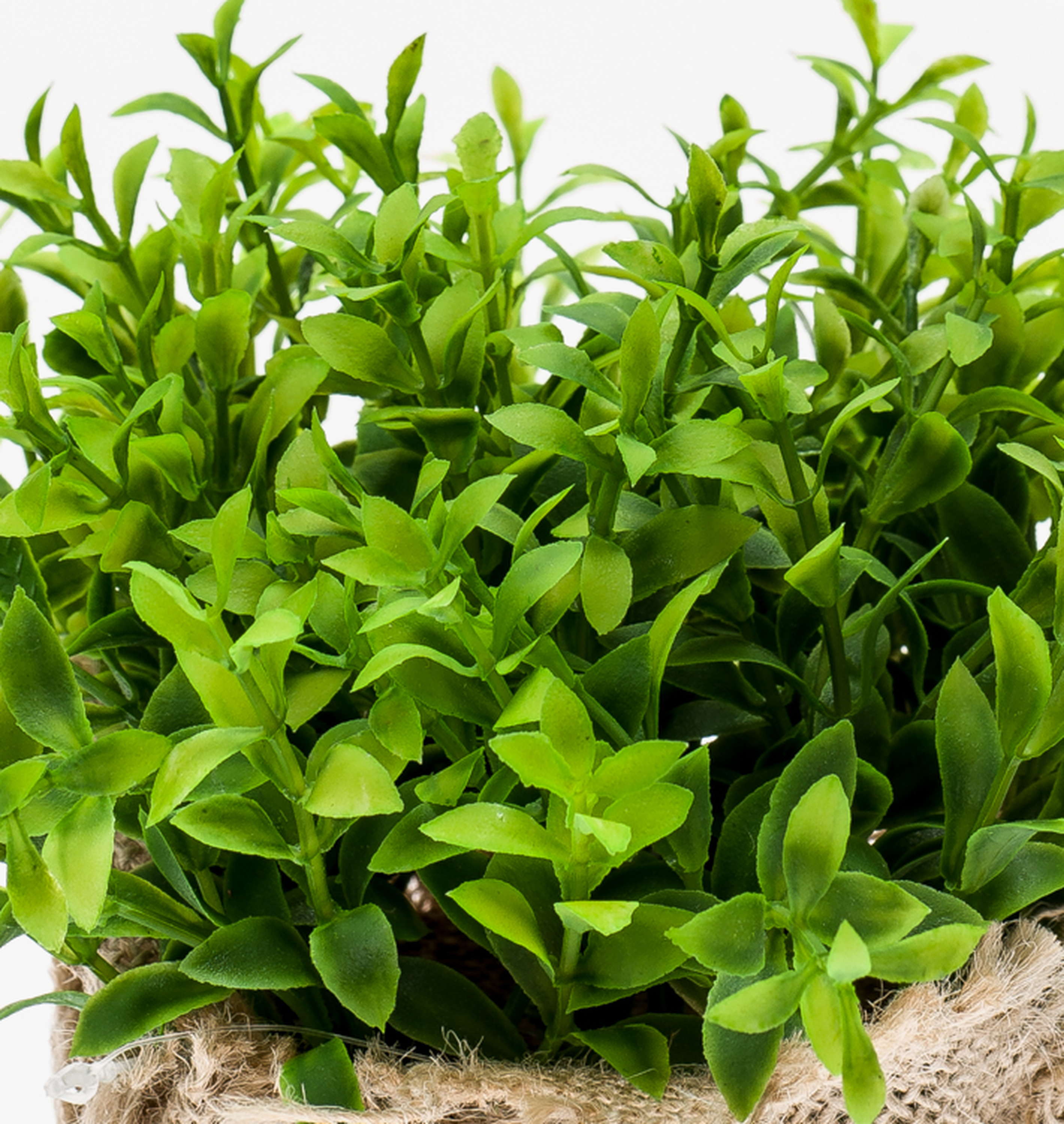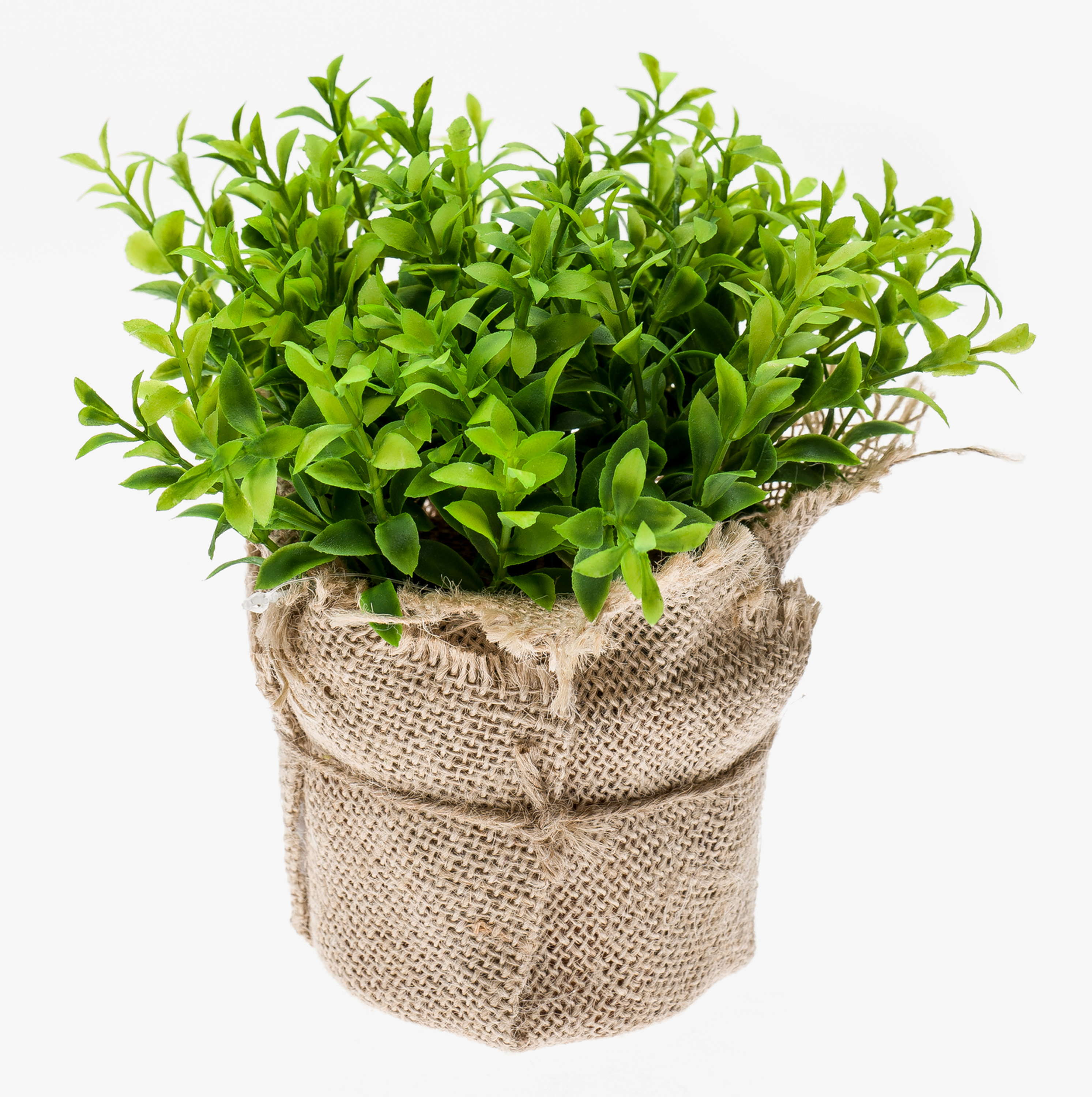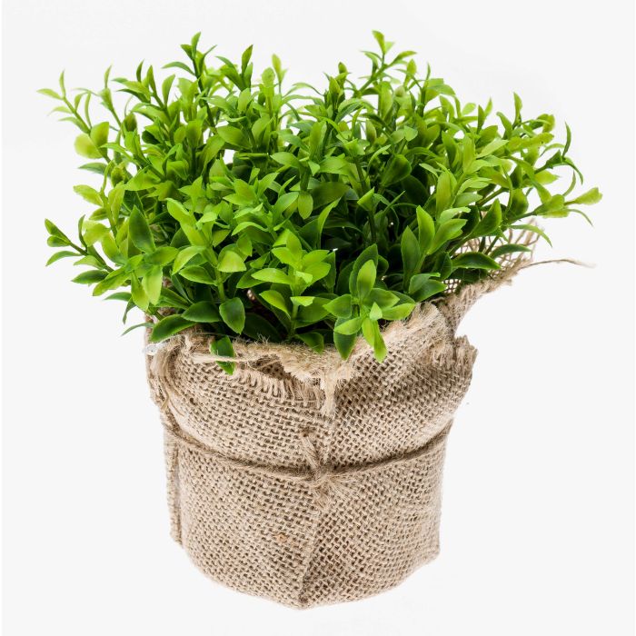 Preciosa planta VITUS con hojas en diferentes tonos para una lograr apariencia natural. El arbusto herbal artificial se encuentra en una bolsa decorativa de yute.