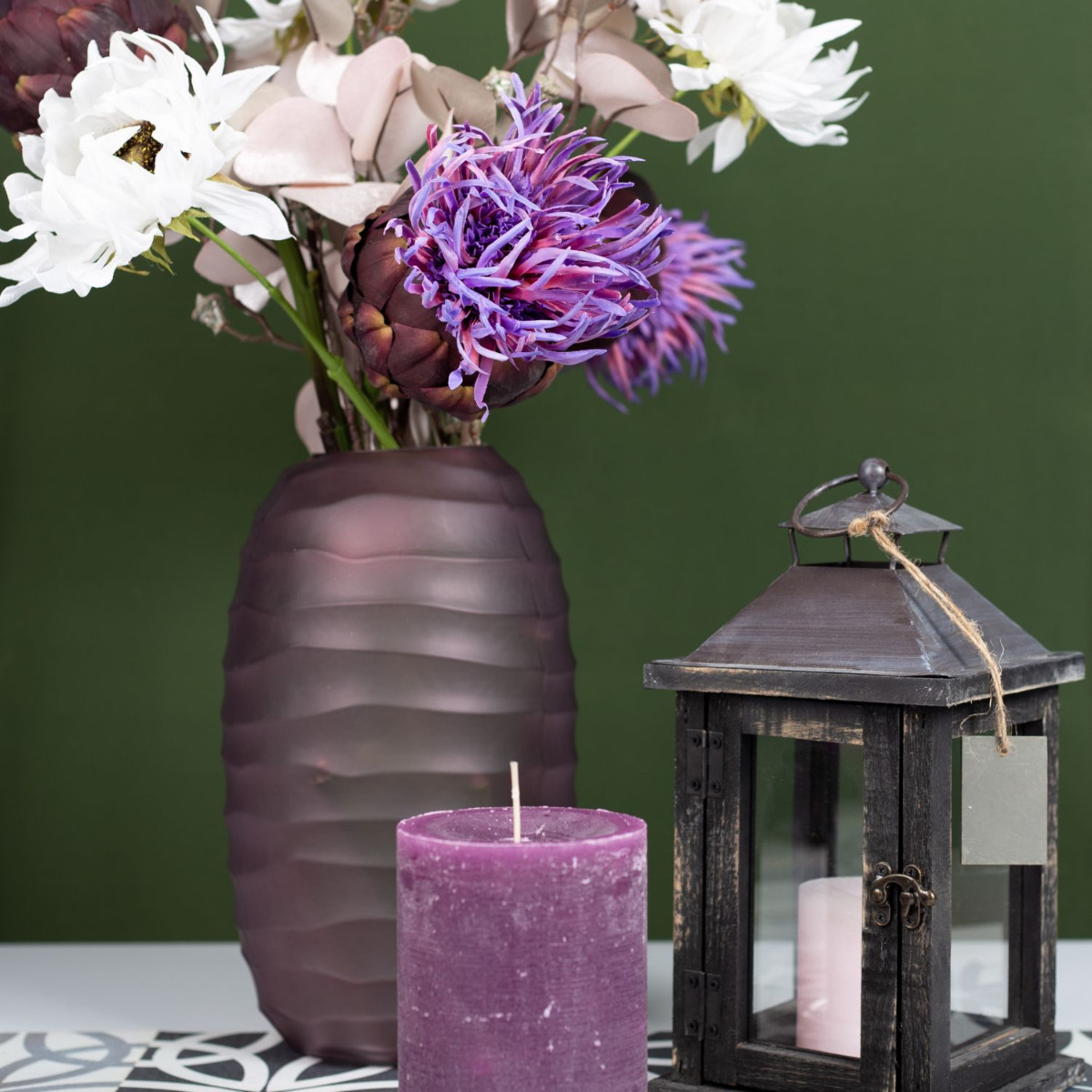 ¡Elegante noche de verano! El jarrón de cristal con diseño ondulado mate está equipado con una extravagante combinación de flores artificiales. Un elegante girasol blanco, una imponente alcachofa púrpura y ramas de eucalipto de color rosa aterciopelado completan el conjunto. Dos velas de pilar en el mismo color con un farol rústico y un plato para velas completan el look con estilo. ¿También quiere dar un nuevo brillo a su espacio vital? ¡Compre el look!