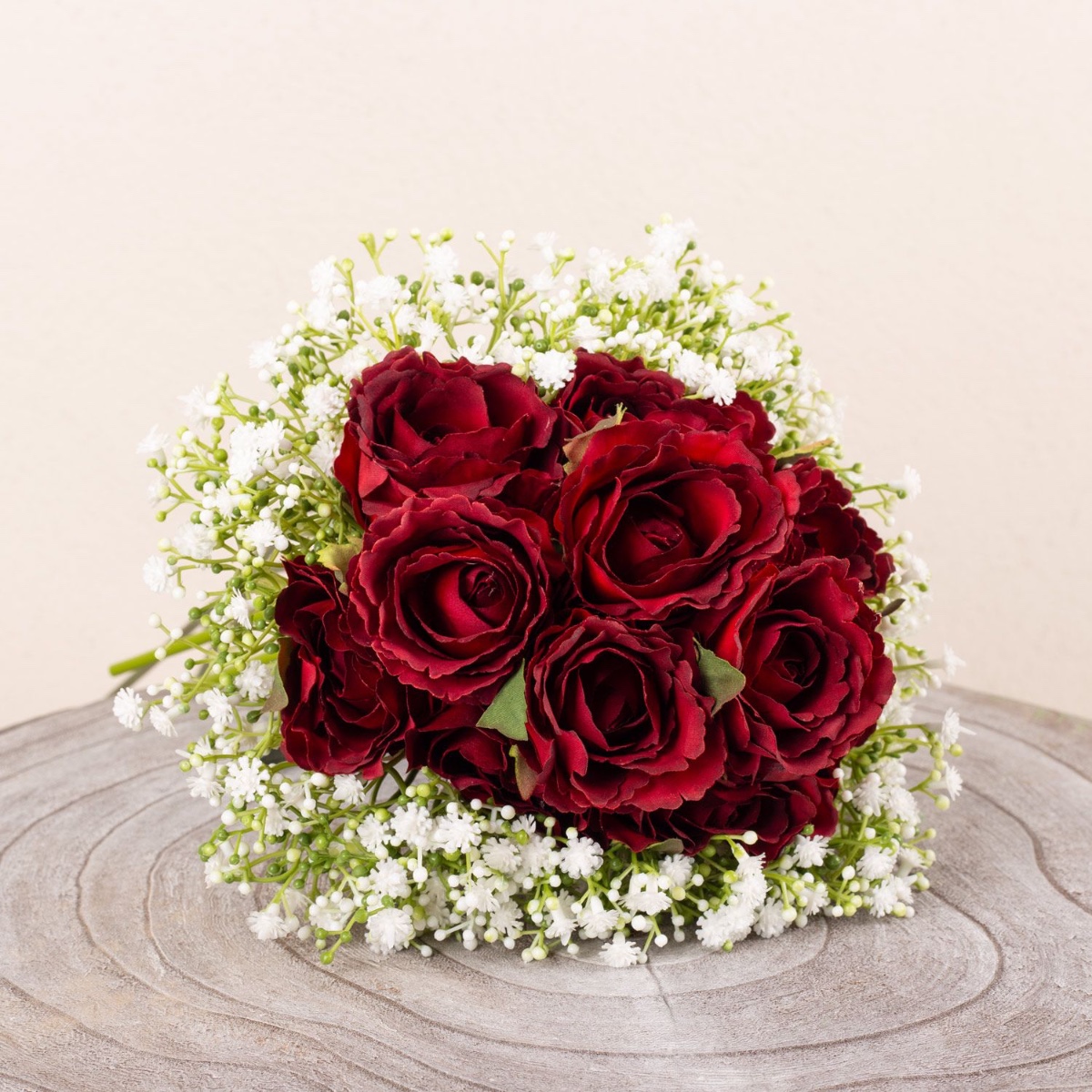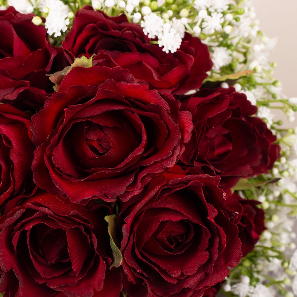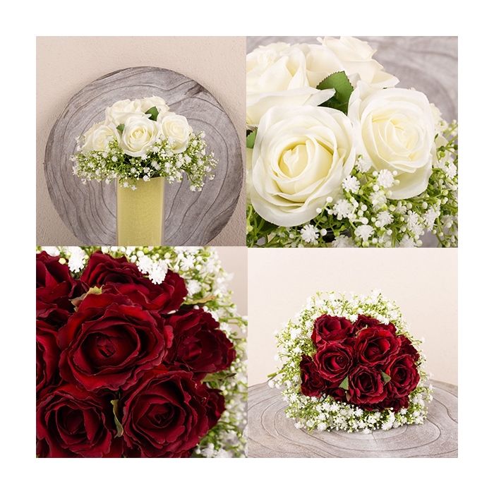 Rosas rojas y blancas No necesitas mucho para hacer un bonito ramo de novia. A veces basta con rosas y gypsophila. Como en este ejemplo. 12 rosas atadas simétricamente en un ramo redondo y compacto, enmarcado por un montón de hierbas. Nuestra clienta lo quería en dos colores, uno para el registro civil y otro para la boda por la iglesia. Para que llegue el gran día. ¡Compra el look!