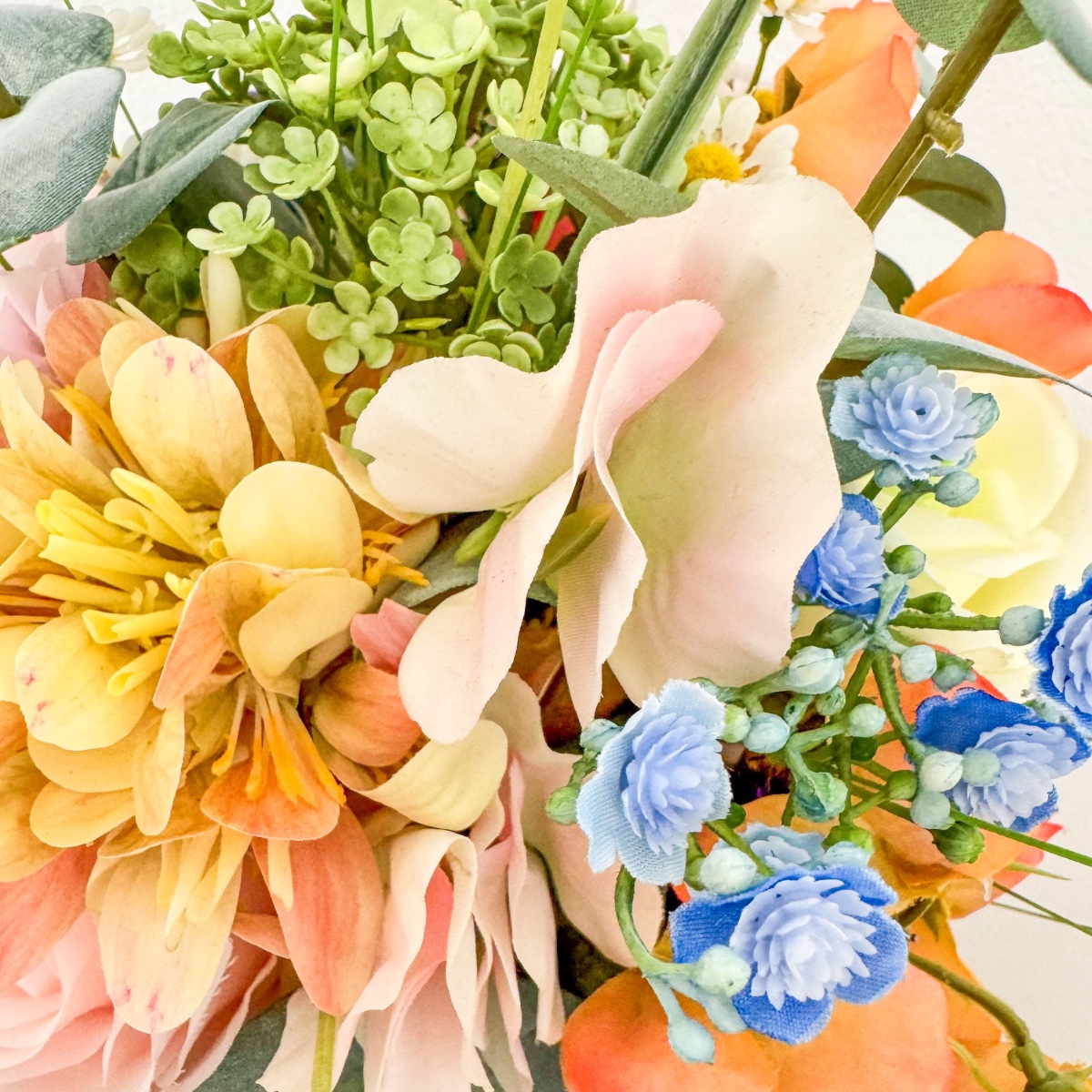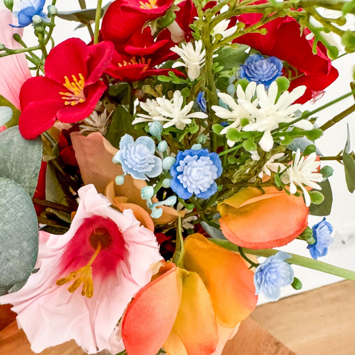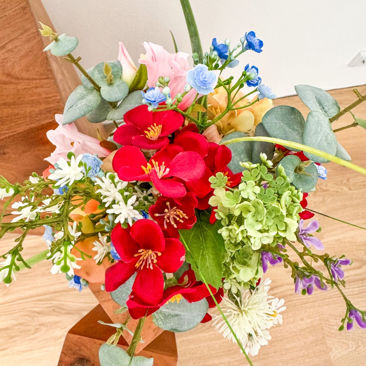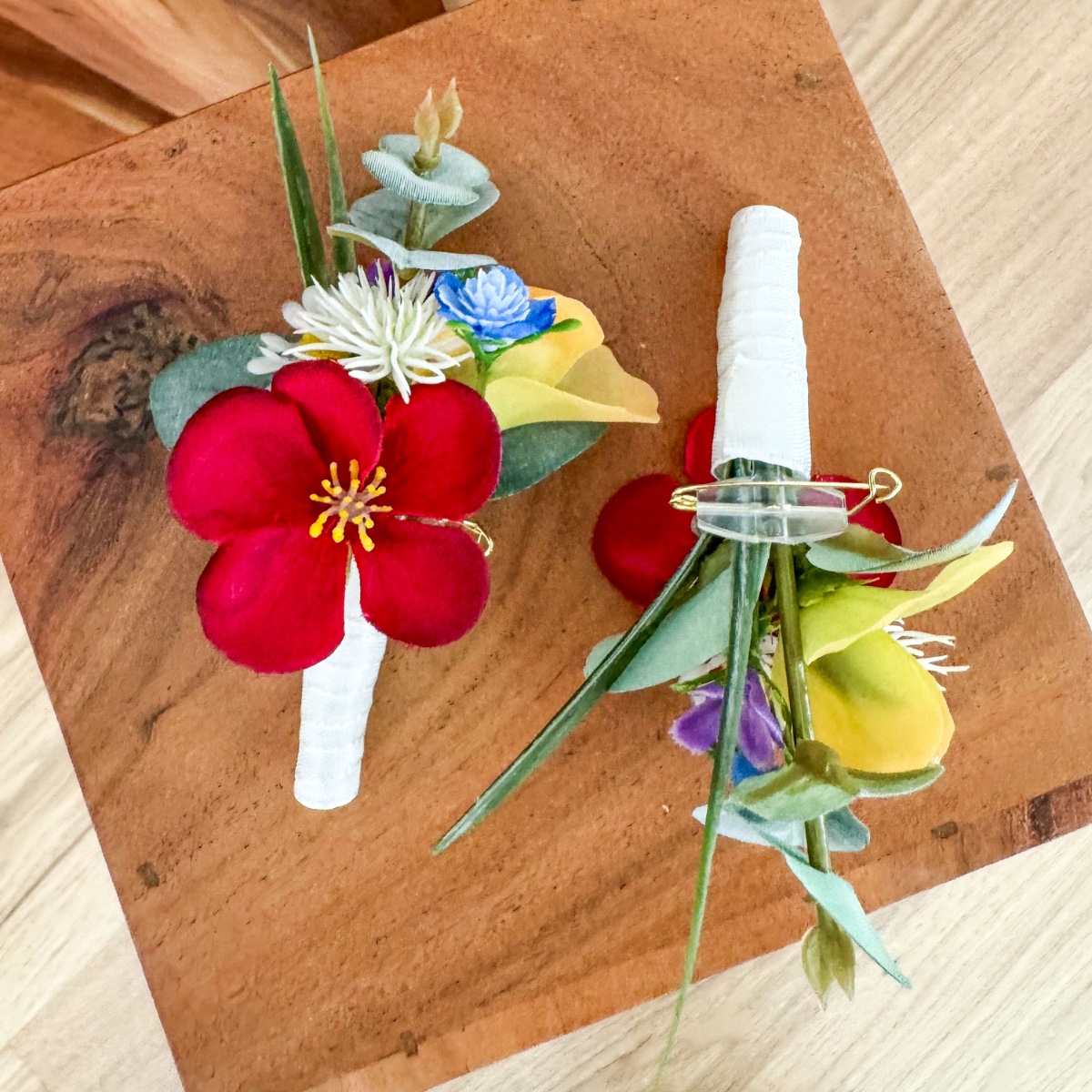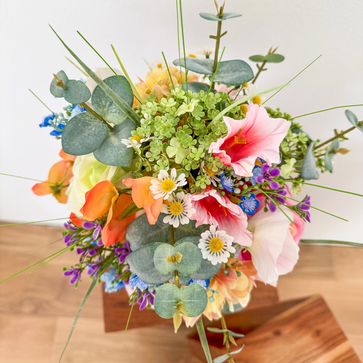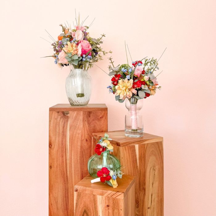 ¡El romanticismo de los prados en su forma más refinada! Inspirado en los deseos personales de la novia y en una imagen de referencia elegida con mucho cariño, se creó este ramo de novia tan especial, diseñado a medida para hacer realidad un auténtico sueño. El deseo: un ramo que capturara la naturalidad de un arreglo floral de prado y que, al mismo tiempo, tuviera un aire elegante y sofisticado. La combinación de numerosas flores, como la escabiosa, las campanillas, el lathyrus, la manzanilla y la centáurea de pradera, da lugar al carácter suelto y ligero de un ramo de flores de pradera. Las rosas y la delicada gypsophila aportan al arreglo una profundidad noble y garantizan un equilibrio elegante entre naturalidad y elegancia. El ramo está atado de forma compacta, lo que le confiere un aspecto especialmente armonioso y de gran calidad. Algunas ramas sueltas —sobre todo hierbas y eucalipto— sobresalen con naturalidad y rompen la forma de manera espontánea. Así se crea una silueta viva con un movimiento suave, que hace que el ramo resulte moderno y romántico a la vez. La paleta de colores, en delicados tonos melocotón, rosa y verde, refleja la romántica ligereza del concepto y subraya el aspecto natural: perfecto para una boda con un toque personal, incluso lejos de casa. El ramo de lanzamiento a juego retoma el diseño y se complementa con pequeñas flores rojas que aportan un toque cariñoso y juguetón. Dos broches a juego completan el conjunto con estilo. Un ramo de novia que demuestra cómo una idea y tus expectativas dan lugar a un diseño floral único: personal, emotivo y con mucho amor por los detalles. ¡Compra el look!