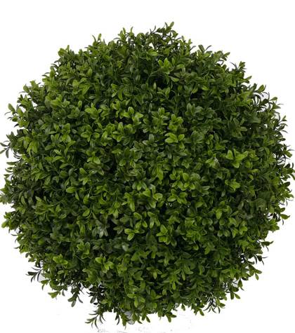 - La bola decorativa de buxus tiene a la naturaleza como modelo, por ello las hojas sobresalen irregularmente y da la impresión de ser una bola de boj cultivada al viento y a la intemperie. Esta versión tiene un núcleo de madera dura en su interior. La superficie de esta bola de boj artificial está sellada con una capa protectora contra los rayos UV. Con un diámetro de 50 cm, puede colocar este arbusto redondo como decoración independiente en un lugar llamativo, o agrupar la bola de boj con bolas de otros tamaños.