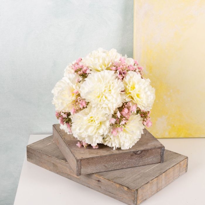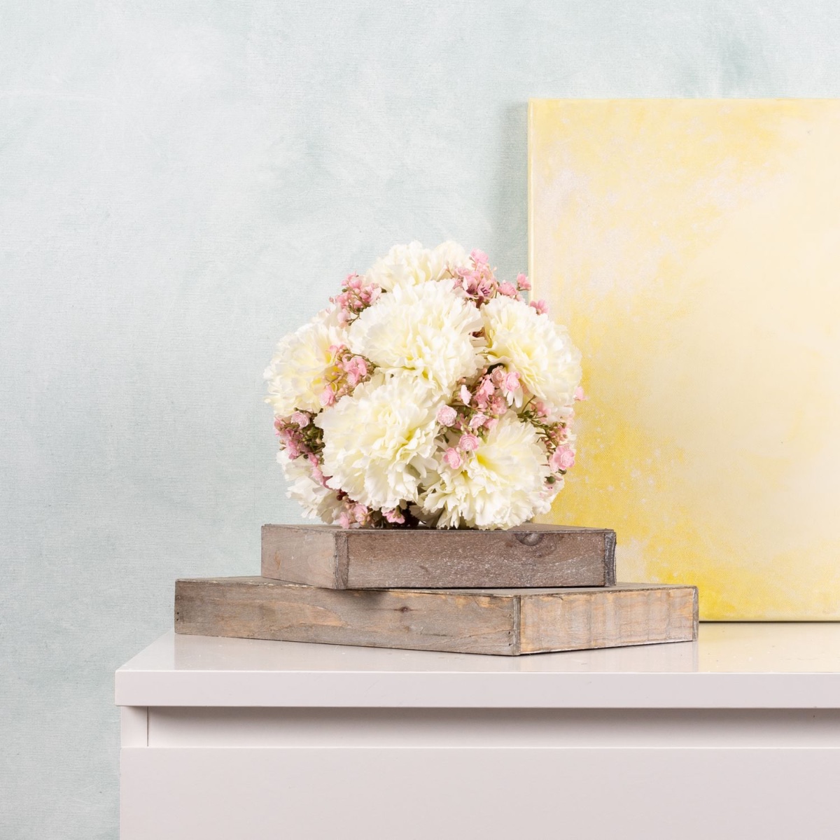 ¡Ronda de flores! ¿Qué tal si, en lugar de un ramo clásico, decoras con una bola de flores? Esta romántica bola de claveles blancos y gypsophila rosa es muy llamativa: delicada, alegre e ideal para ocasiones festivas o simplemente como un detalle encantador para el día a día. ¡Compra el look!