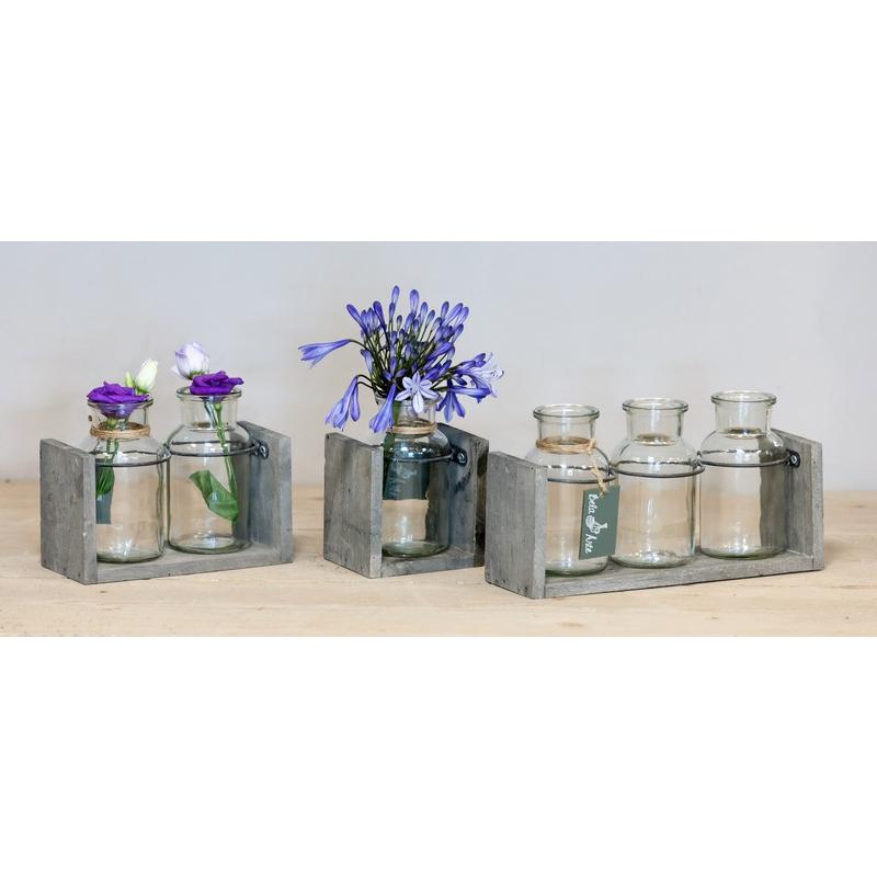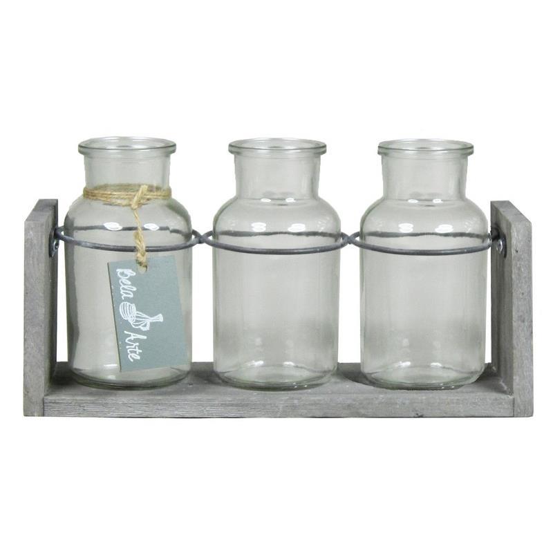Botellas decorativas LORRIE, vidrio, con soporte de madera, 3 vasos, transparentes, 25 x 8 x 13 cm