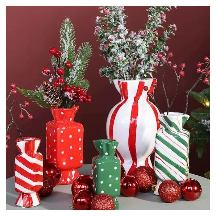 ¡Toques dulces en la magia del invierno! Entre las discretas bolas navideñas brillantes se crea un delicado juego de luces, como si un suave resplandor cubriera la habitación. Las bolas reflejan la luz y aportan toques claros y tranquilos. Junto a ellas hay jarrones con forma de caramelos de colores, brillantes como dulces recién sacados de un enorme tarro de azúcar. Los tonos intensos pero armoniosos aportan una sensación de calidez y ligereza al paisaje invernal. De ellos sobresalen ramas nevadas, cuyas puntas claras crean un agradable contraste. Entre ellas brillan bayas rojas, claras y precisas, como pequeños puntos de color que mantienen unido el arreglo. El resultado es un look moderno, colorido y, sin embargo, claramente invernal. Una combinación de delicados momentos de escarcha y colores vivos. Aporta a la habitación una tranquila festividad que resulta acogedora sin imponerse. ¡Compra el look!