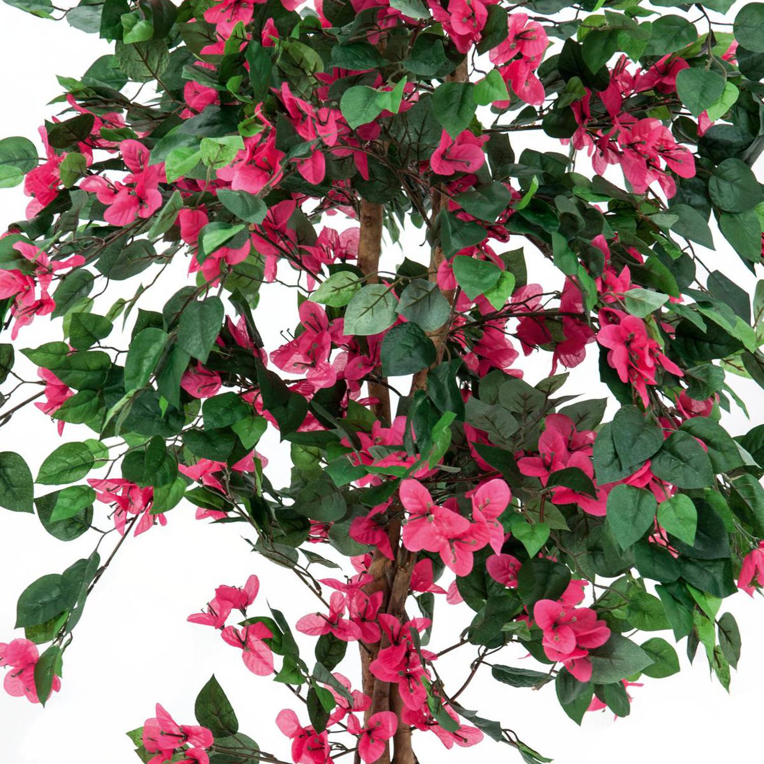 - Tronco natural / lianas con cerca de 1000 hojas en color verde oscuro y flores en fucsia de fibra textil de alta calidad