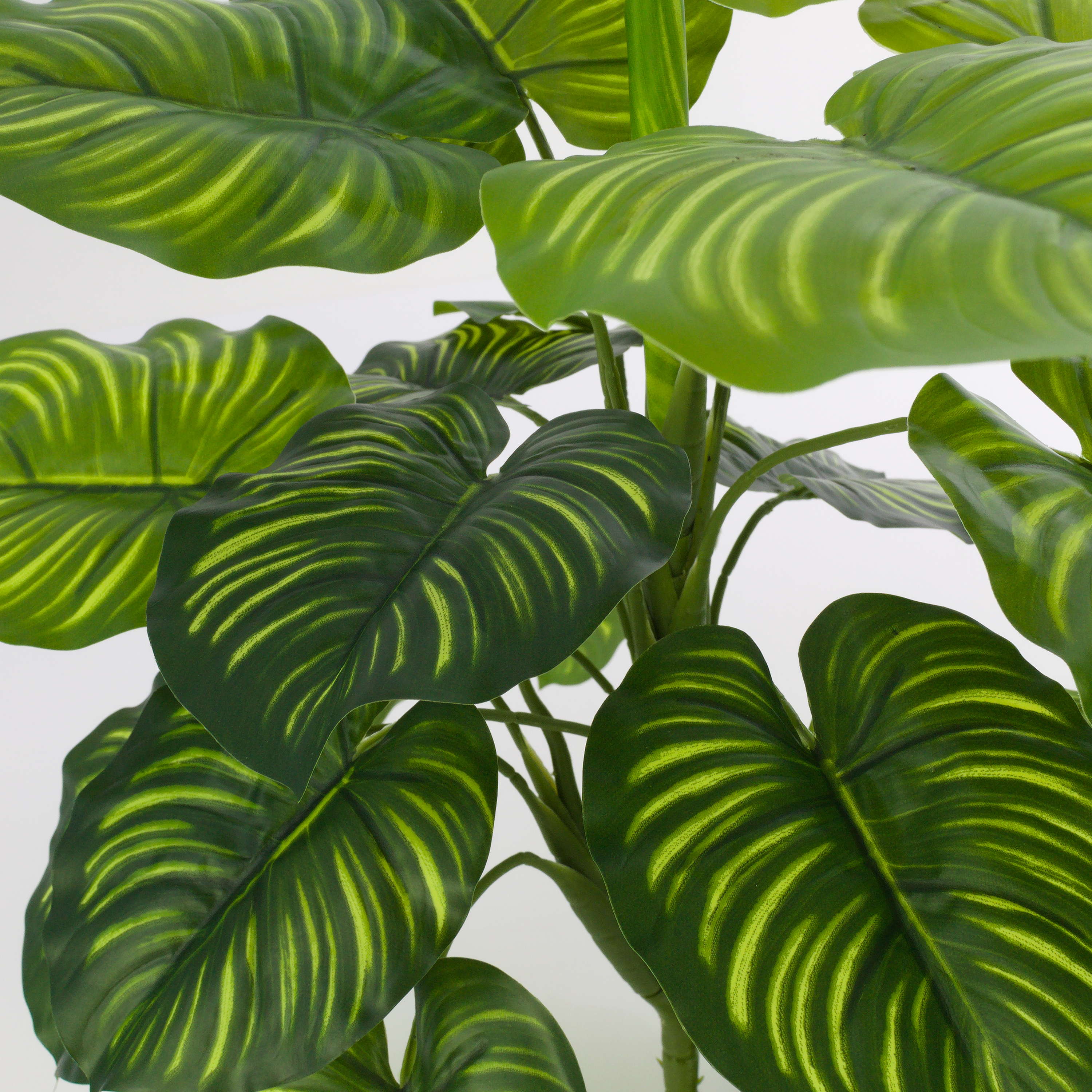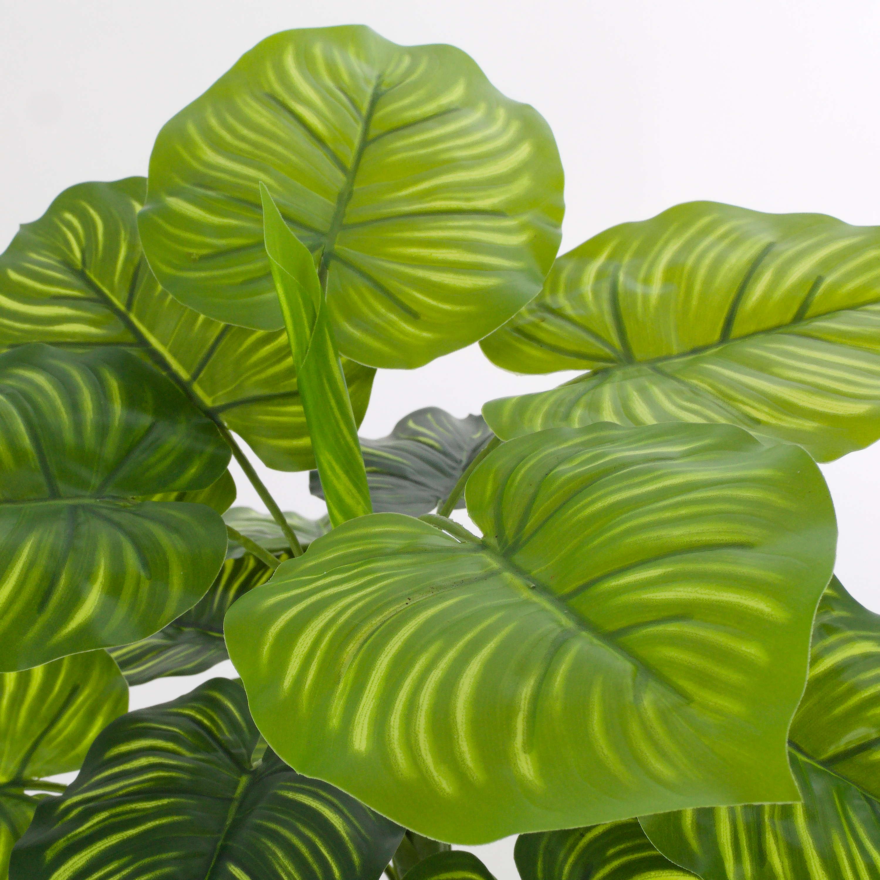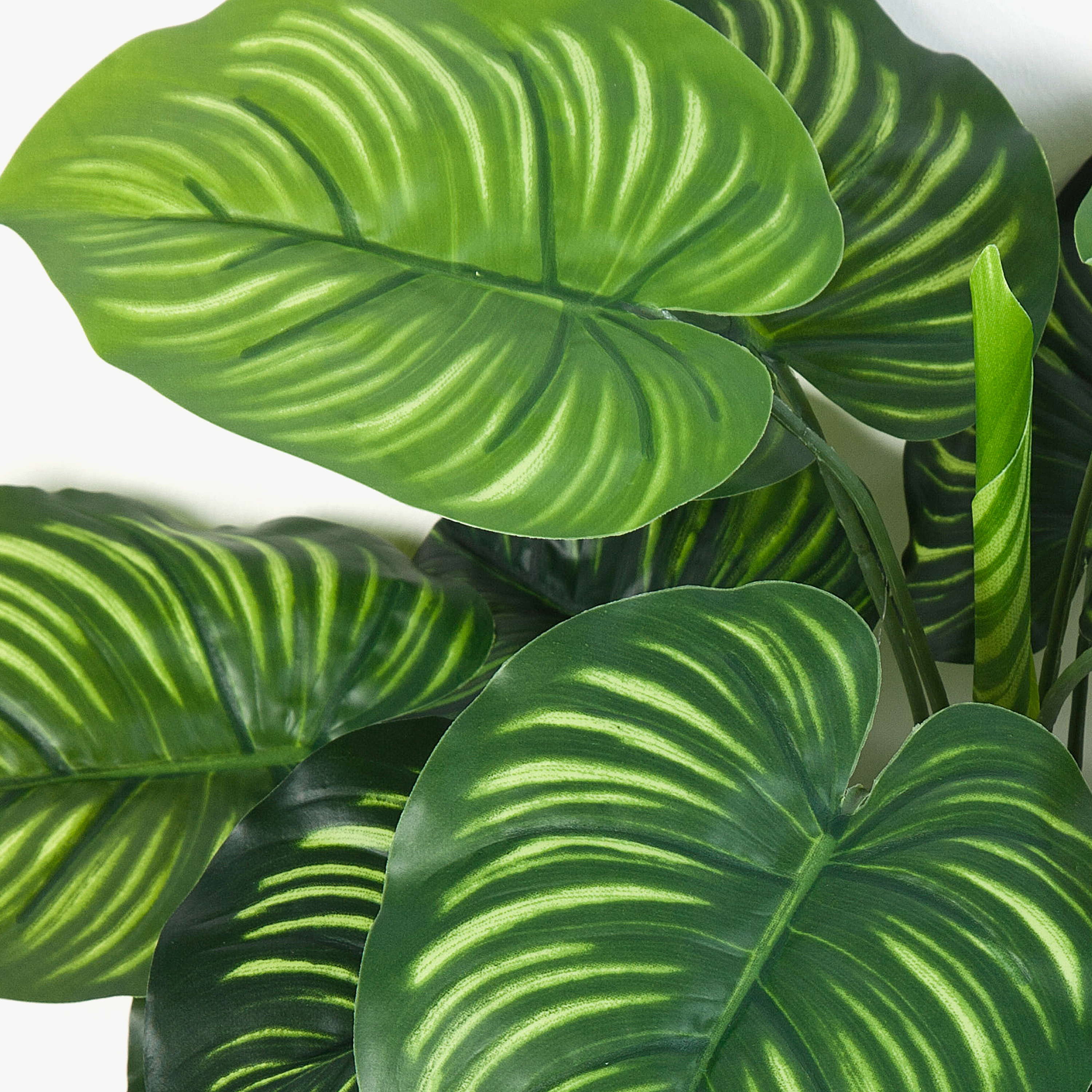 Calatea artificial ULANI con hojas en forma de corazón y rayas de color verde claro que le otorgan un aspecto natural. La planta artificial mide 45 cm de alto, aprox.