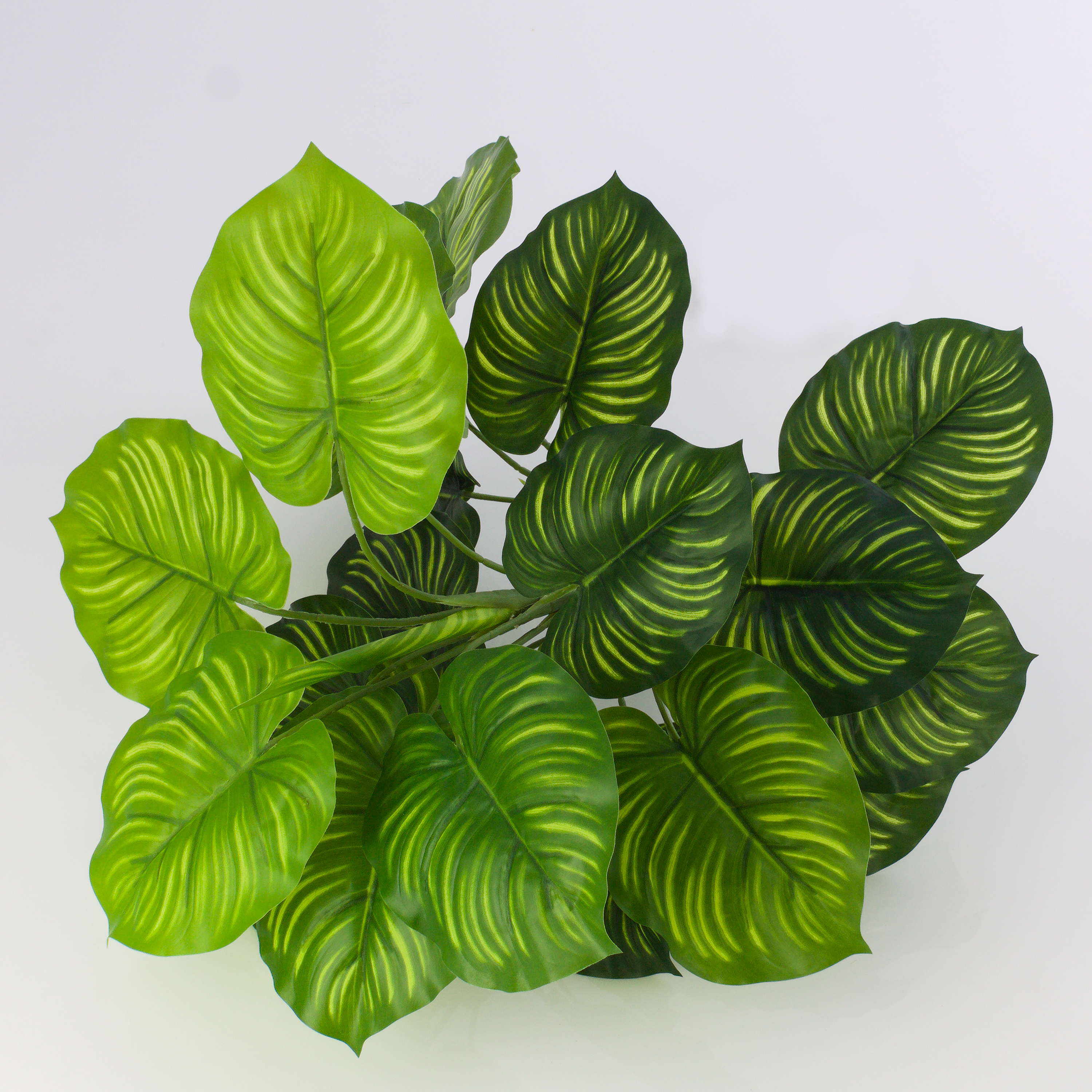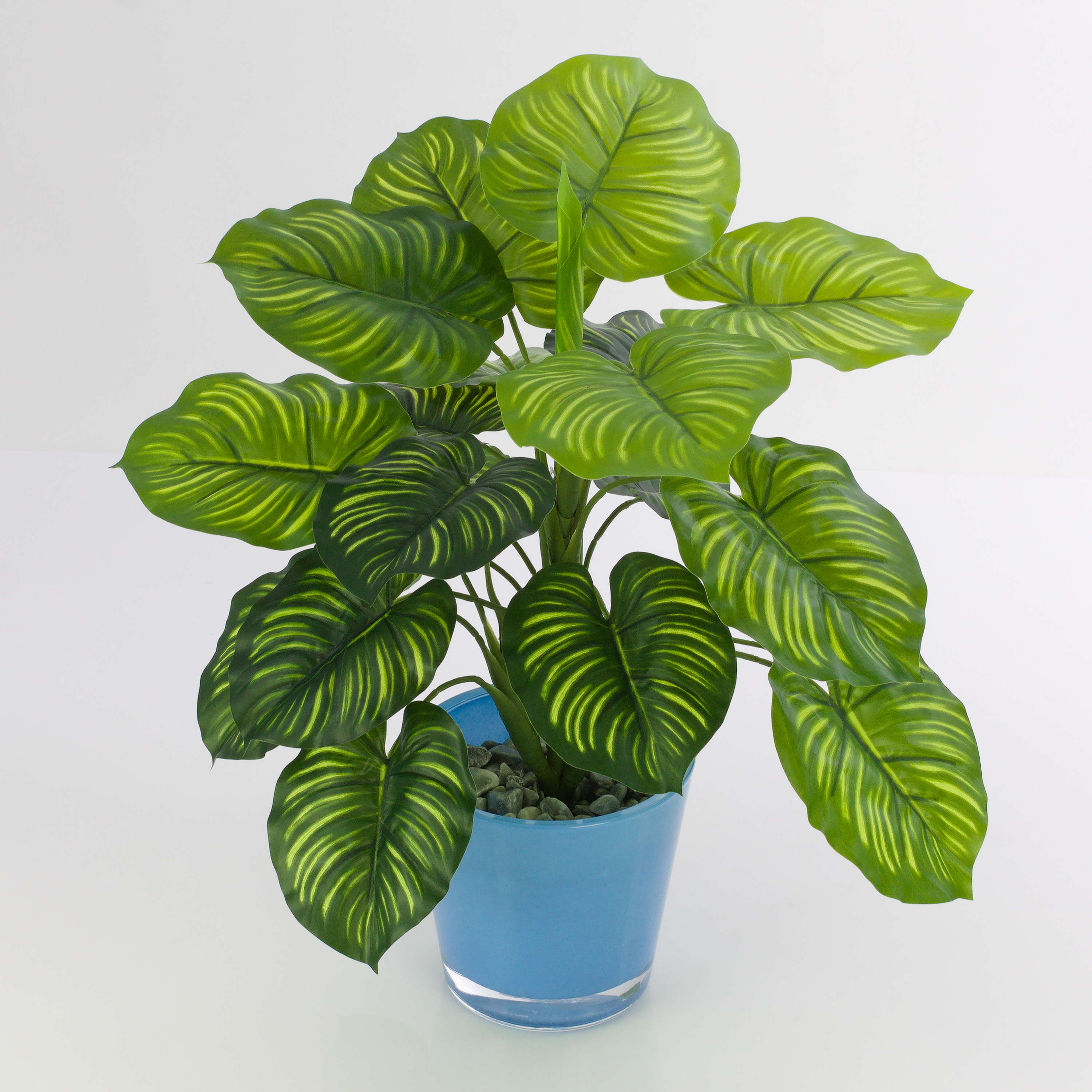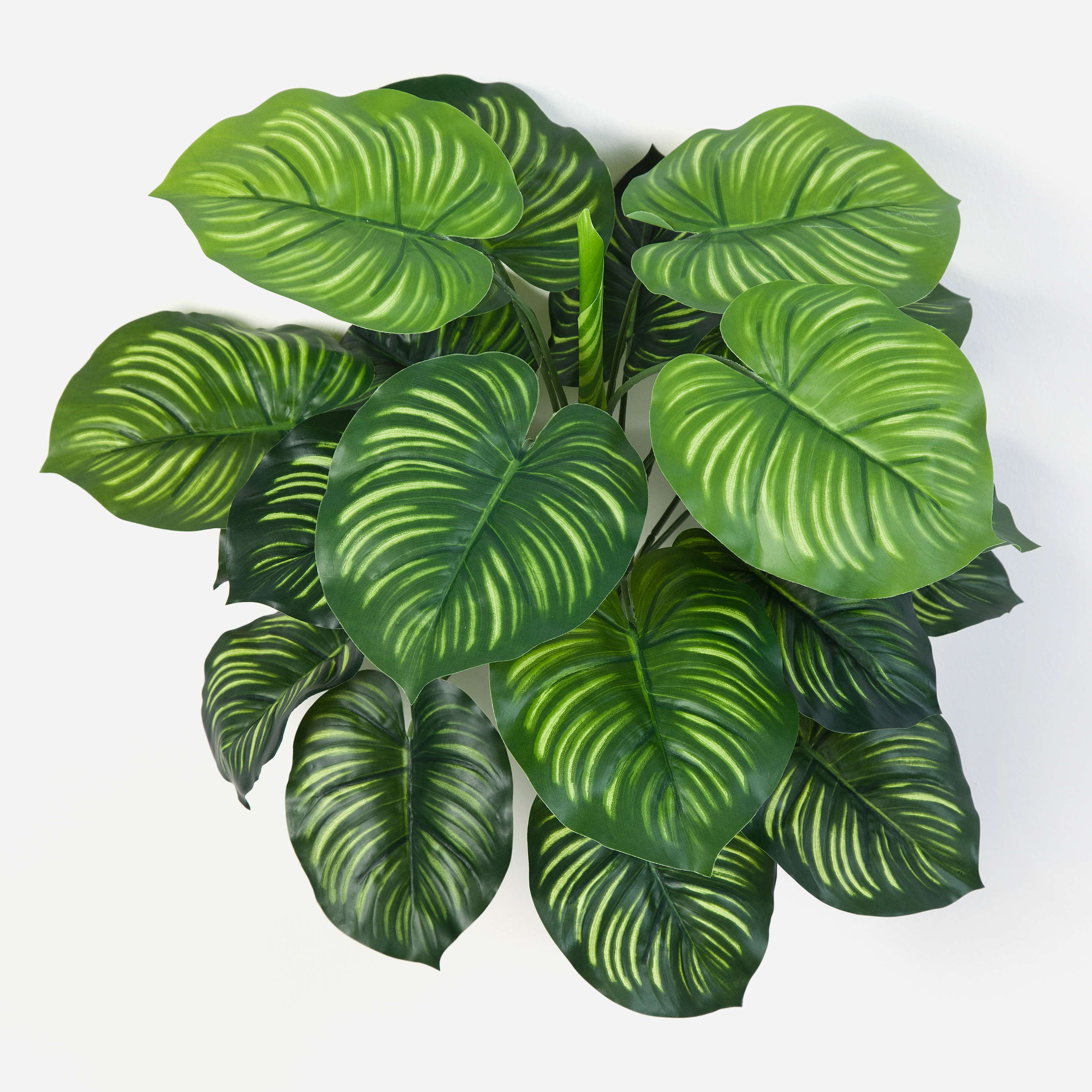 Calatea artificial ULANI con hojas en forma de corazón y rayas de color verde claro que le otorgan un aspecto natural. La planta artificial mide 45 cm de alto, aprox.